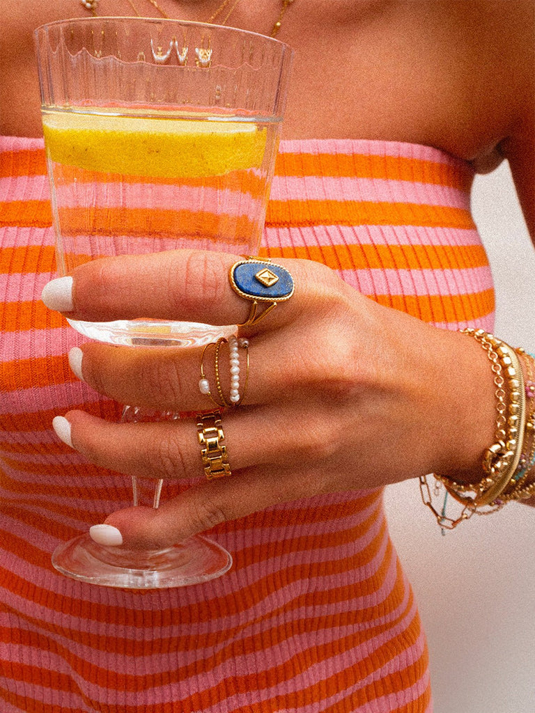 Inspiriert von einer modernen und selbstbewussten Ästhetik fängt dieser tiefblaue Ring alle Blicke mit seinem ovalen Lapis-Lazuli-Stein ein, der durch ein zentrales geometrisches Muster hervorgehoben wird. Seine Fassung aus 18K vergoldetem Edelstahl verleiht ihm einen luxuriösen Glanz und eine dauerhafte Widerstandsfähigkeit im Alltag.