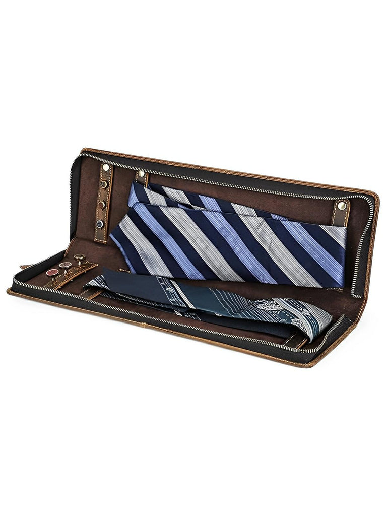 Entdecken Sie ein Aufbewahrungsetui, das für Liebhaber raffinierter Accessoires gedacht ist. Hergestellt aus echtem Leder, schützt und organisiert dieses elegante Etui Ihre Krawatten und Manschettenknöpfe stilvoll und praktisch.