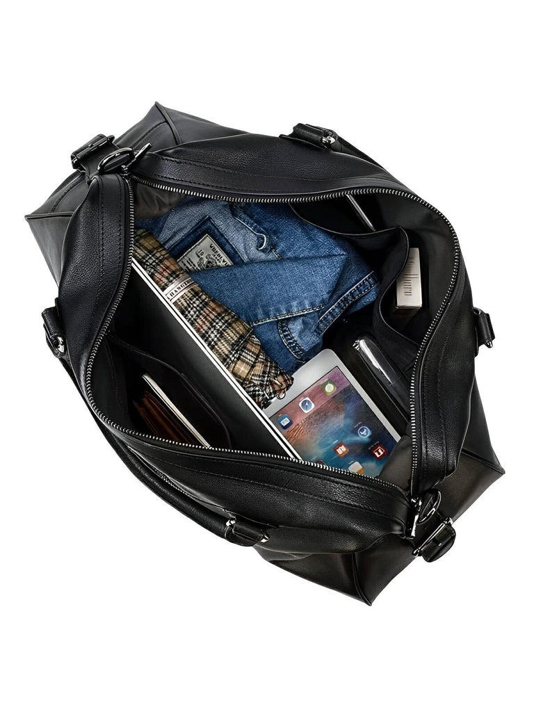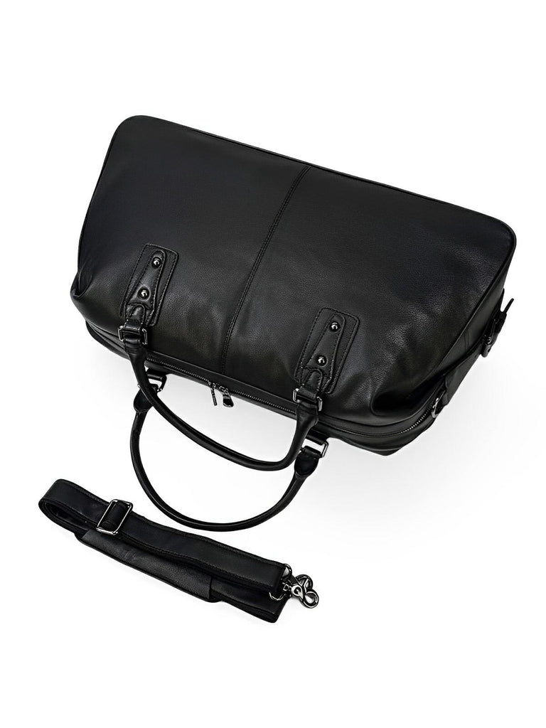 Das schlichte und moderne Design dieser schwarzen Ledertasche passt zu allen Gelegenheiten, egal ob Reisen, Sportausflüge oder Geschäftsreisen. Seine Metallverstärkungen unter dem Boden sorgen für erhöhte Stabilität und Haltbarkeit.