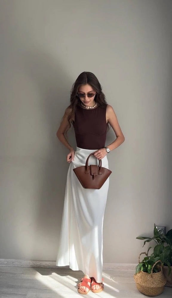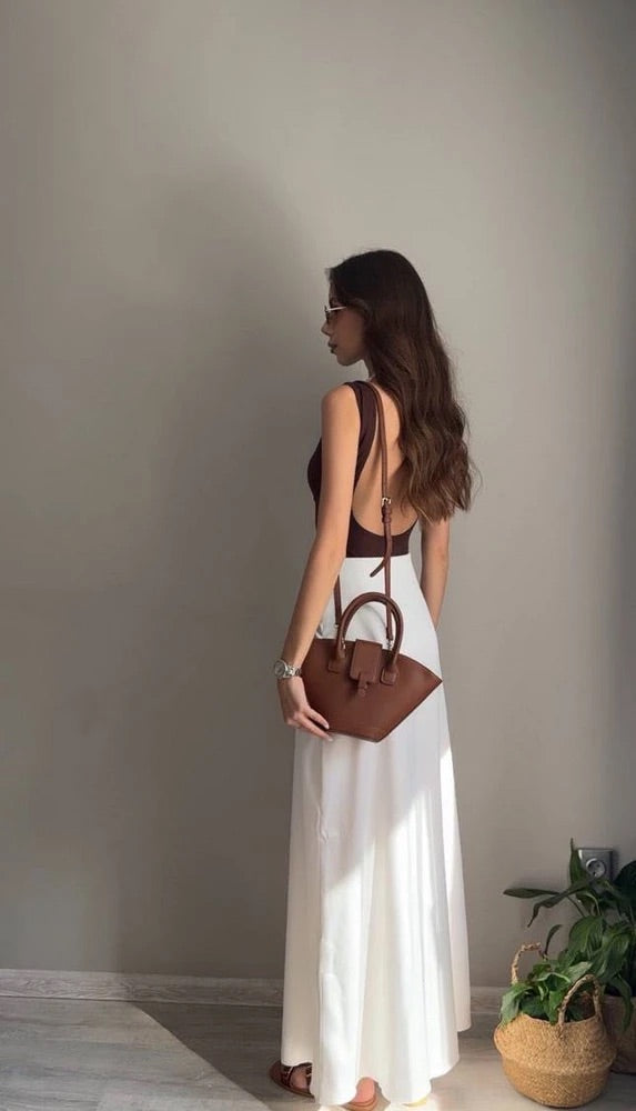 Die Außenbeschichtung aus glattem veganem Kunstleder bietet eine schöne matte und weiche Haptik in einem warmen Braunton, der sich leicht mit einer Sommer- oder Übergangsgarderobe kombinieren lässt.