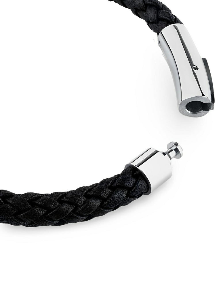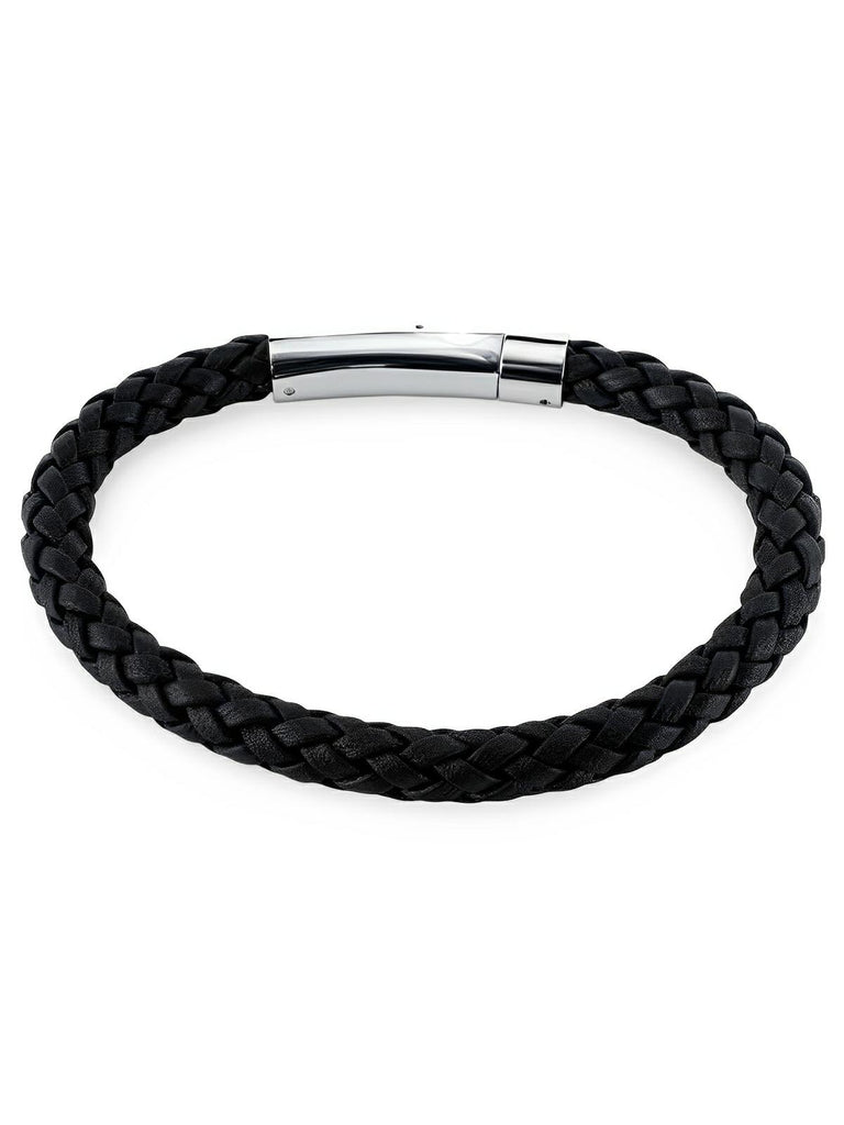 Dieses maskuline Armband verbindet Schlichtheit und Modernität mit einem raffinierten Design, das für alle Gelegenheiten geeignet ist. Es ist aus gewebtem schwarzem Leder gefertigt, bietet eine raffinierte Textur und fühlt sich angenehm am Handgelenk an. Sein Ratschenverschluss aus 316L-Edelstahl gewährleistet eine sichere und dauerhafte Befestigung und ist gleichzeitig korrosionsbeständig und hypoallergen.