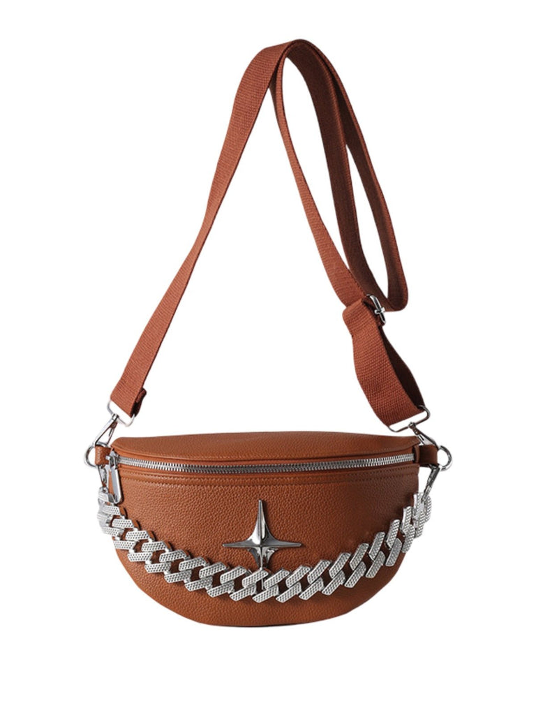 Mit seiner zeitgenössischen Silhouette und den markanten metallischen Details verwandelt diese Gürteltasche aus Kunstleder jedes Outfit in einen selbstbewussten Look. Entworfen für diejenigen, die Stil und Praktikabilität verbinden möchten, kann sie sowohl über der Schulter als auch quer getragen werden.