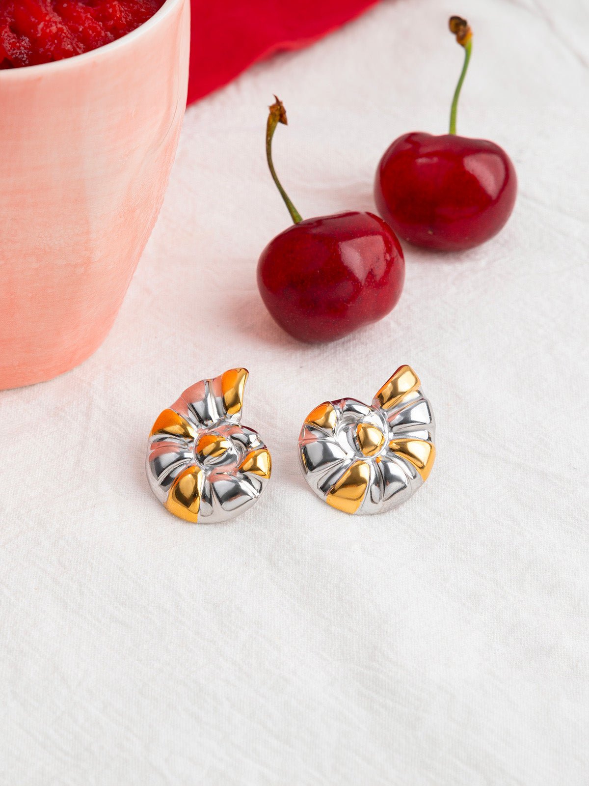 Diese Ohrringe mit einem vom Meeresmuschel inspirierten Design zeigen eine sanfte und skulpturale geometrische Silhouette. Hergestellt aus Edelstahl und veredelt mit einer bicolor gold- und silberfarbenen Beschichtung, fangen sie das Licht mit Glanz und Kühnheit ein.