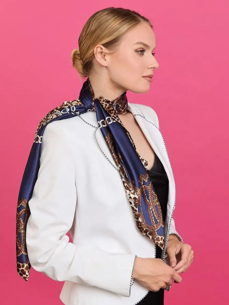 Damen quadratisches Halstuch, marineblaues Leopardenmuster Halstuch, modisches Accessoire mit Kettenmuster, satinierter Seidenoptik Polyester, Halstuch für Haare, Tasche, Hals, schickes Geschenkidee für Frauen, Modell Kathina