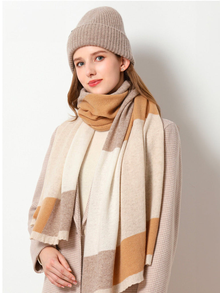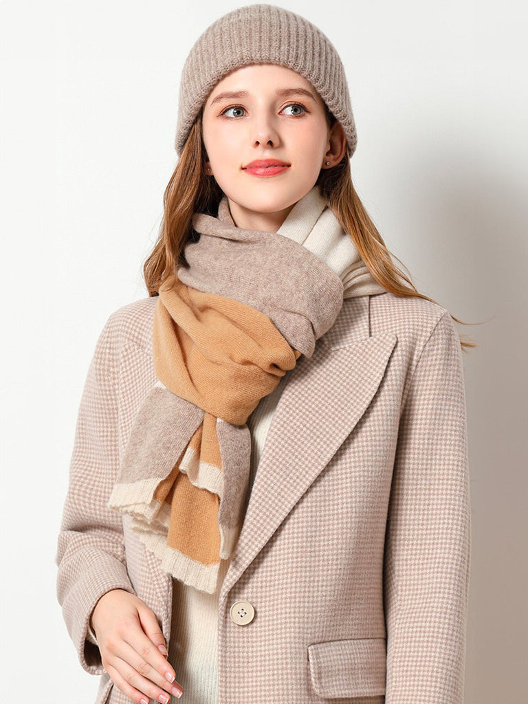 Bringen Sie mit diesem Schal aus reiner Wolle im dreifarbigen Stil Komfort und Sanftheit in Ihre Wintertage. Hergestellt aus 100 % hochwertiger Wolle, ist er speziell darauf ausgelegt, einen optimalen Wärmeschutz zu bieten und gleichzeitig Ihr Outfit mit seinem raffinierten Design aus sanften und kontrastreichen Farbblöcken zu veredeln.