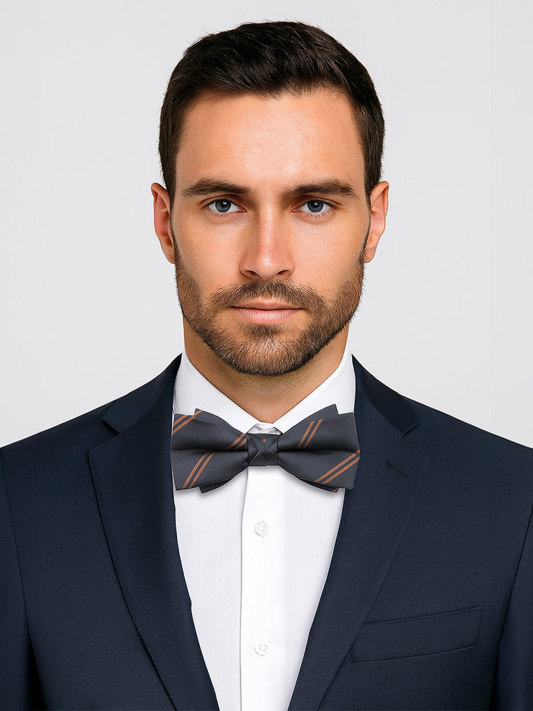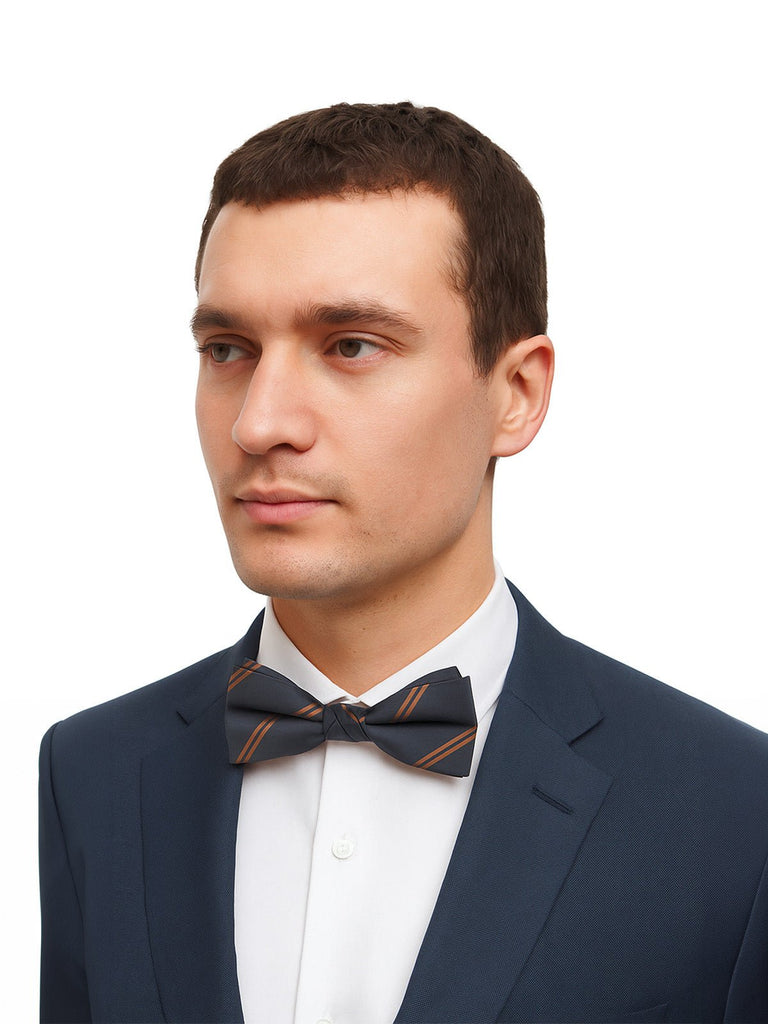 Bekunden Sie Ihren Stil mit dieser zum Binden vorgesehenen Fliege, die für Männer entworfen wurde, die klassischen Chic mit markanten Details verbinden möchten. Ihr Muster mit kupferfarbenen diagonalen Streifen auf dunkelblauem Grund fängt subtil das Licht ein, perfekt für eine Fest-, Hochzeits- oder formelle Veranstaltungskleidung.