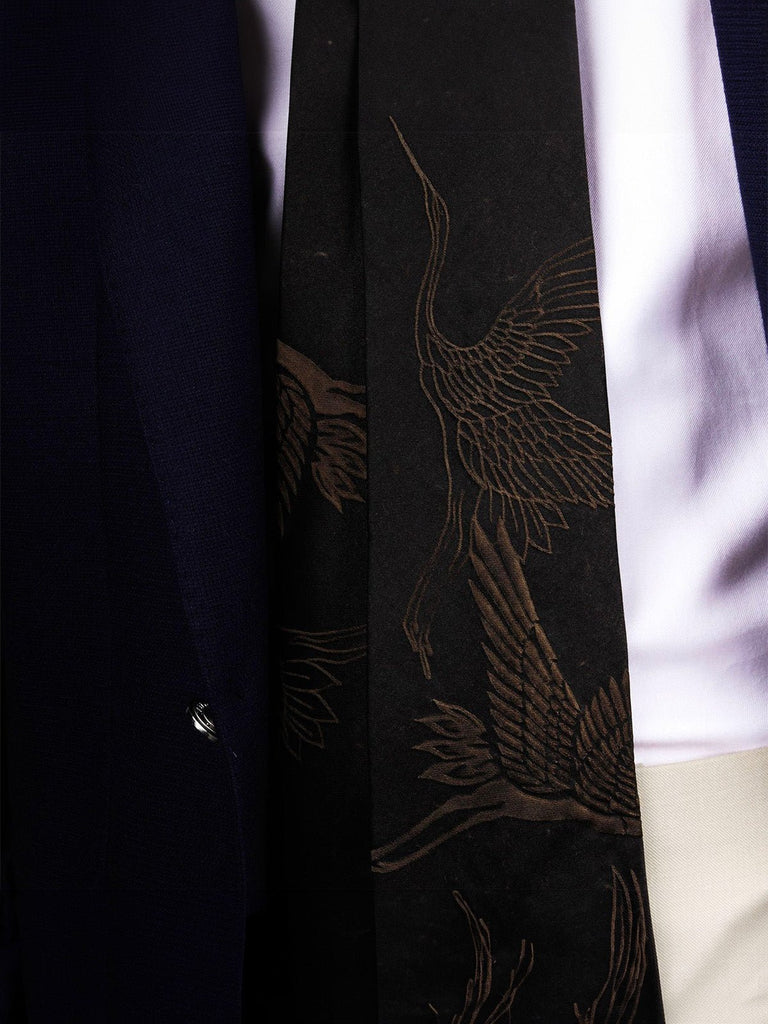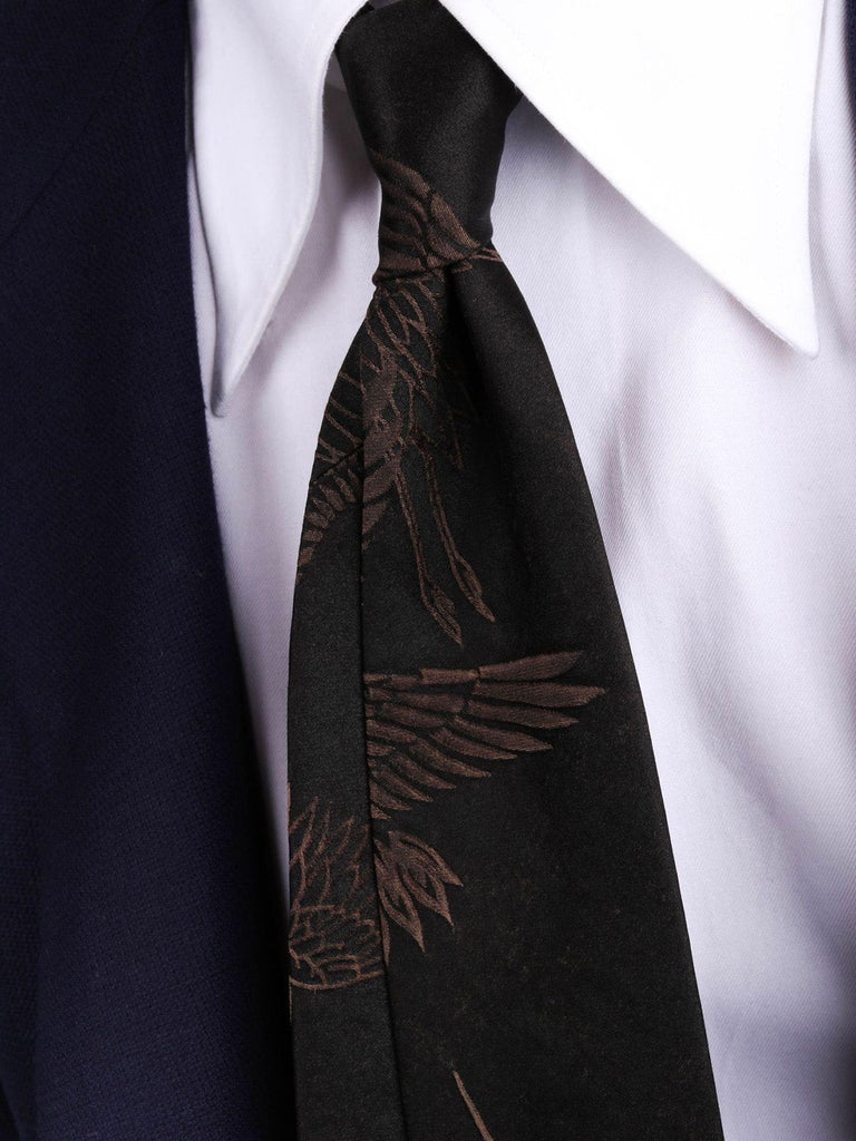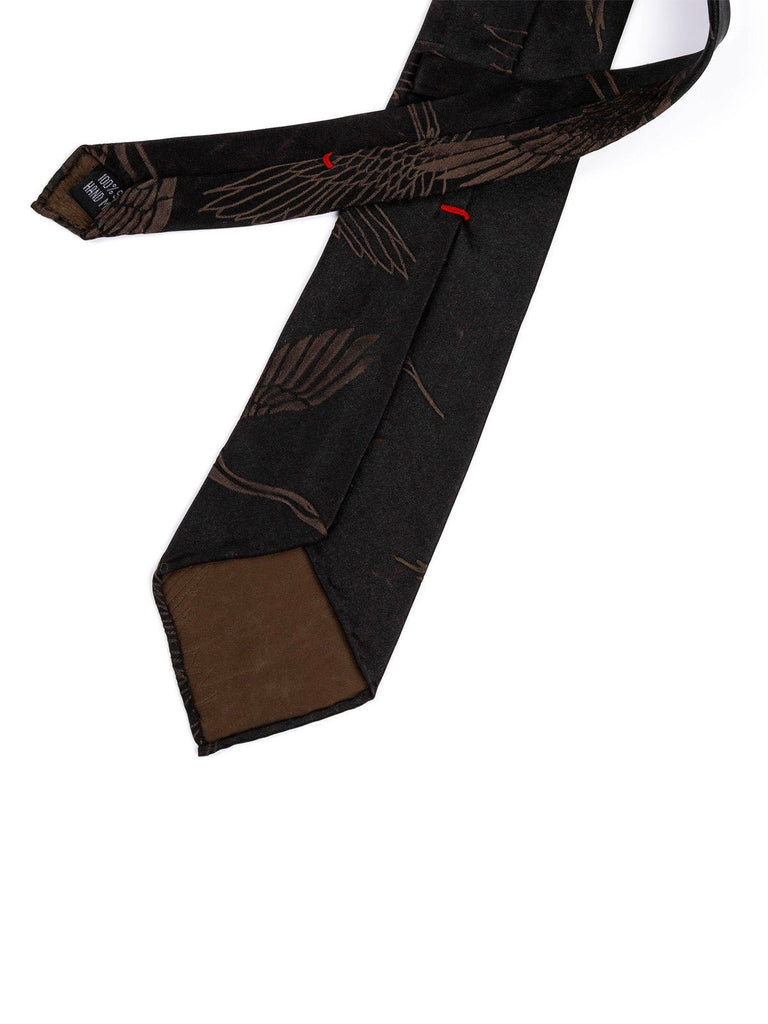 Cravate homme en soie, motif grue, finition roulottée main, cravate trois plis, style chinois traditionnel, sans doublure, texture fluide, modèle Aurélien - Bonnets - Café