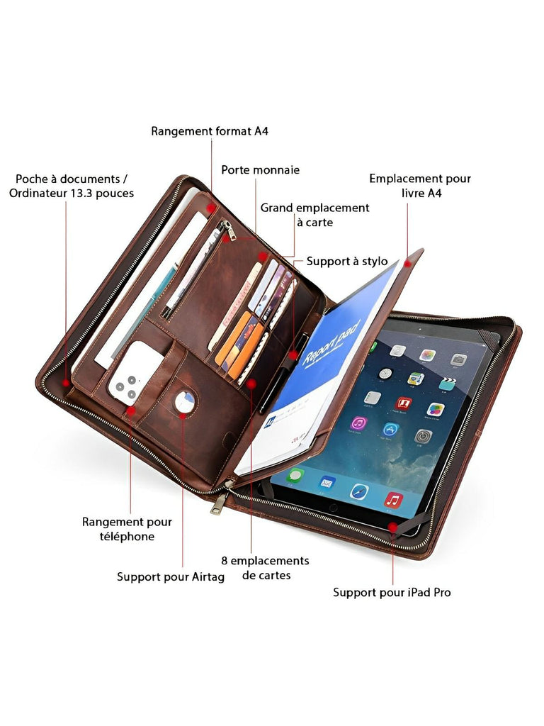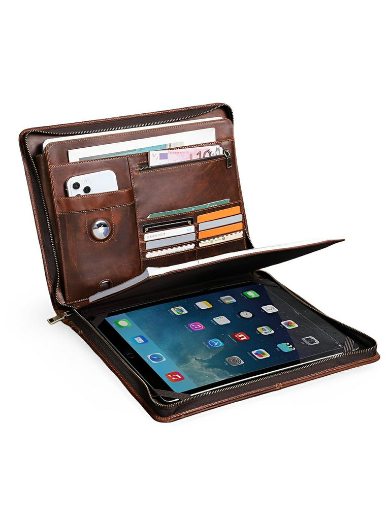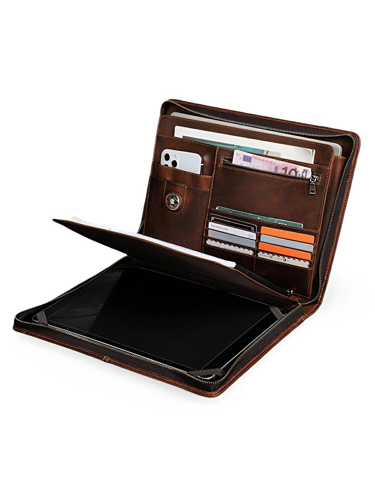 Housse en cuir marron pour ordinateur portable, tablette et documents, porte - cartes intégré, format A4, modèle Pamphil - Housse - Café