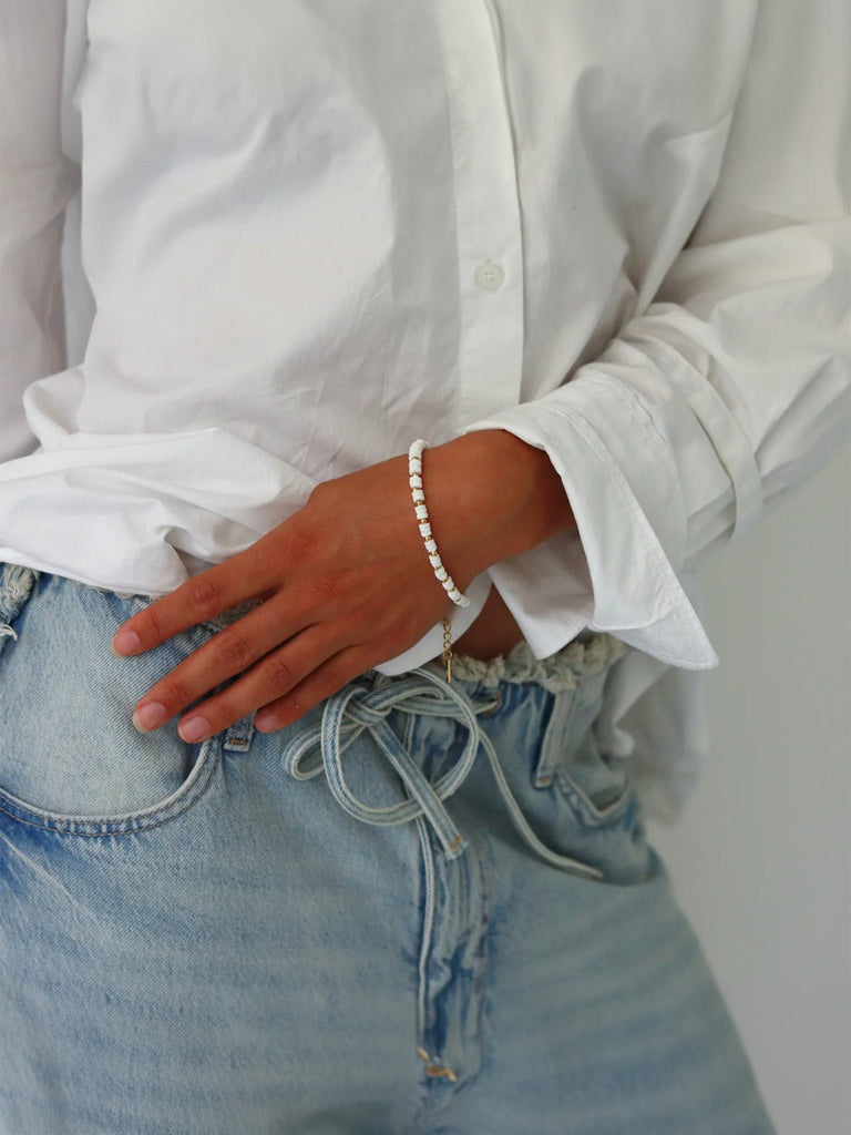 Fügen Sie Ihren Outfits mit diesem weißen Muschelarmband, das zart mit goldenen Perlen verziert ist, einen leuchtenden Akzent hinzu. Dieses Schmuckstück fängt den Geist sonniger Tage ein, egal ob es allein getragen wird oder in Kombination mit anderen Armbändern für einen raffinierten Lagenlook.