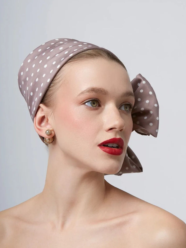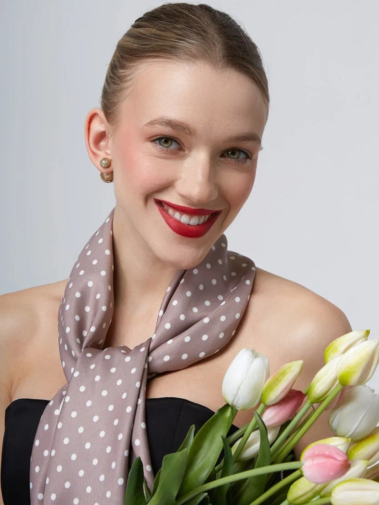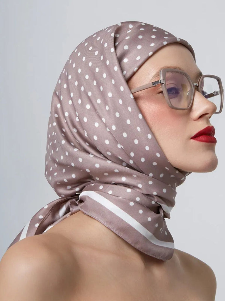 Sein weiß gepunktetes Muster auf puderbeigem Hintergrund passt leicht zu allen Stilen, vom klassischsten bis zum trendigsten. Sie können ihn um den Hals tragen, als Kopfschmuck oder sogar als leichten Schal über den Schultern.