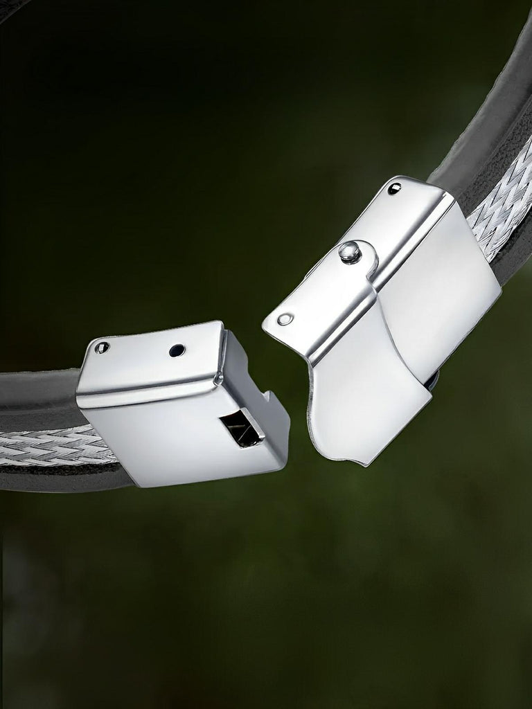 Bestätigen Sie Ihren Stil mit diesem Herrenarmband aus Leder und Edelstahl, das entworfen wurde, um Charakter und Raffinesse zu vereinen. Sein strukturiertes Design kombiniert ein echtes Lederband mit Details aus Edelstahl, was eine sowohl robuste als auch anspruchsvolle Ästhetik bietet.