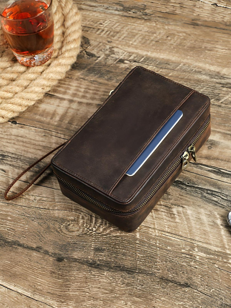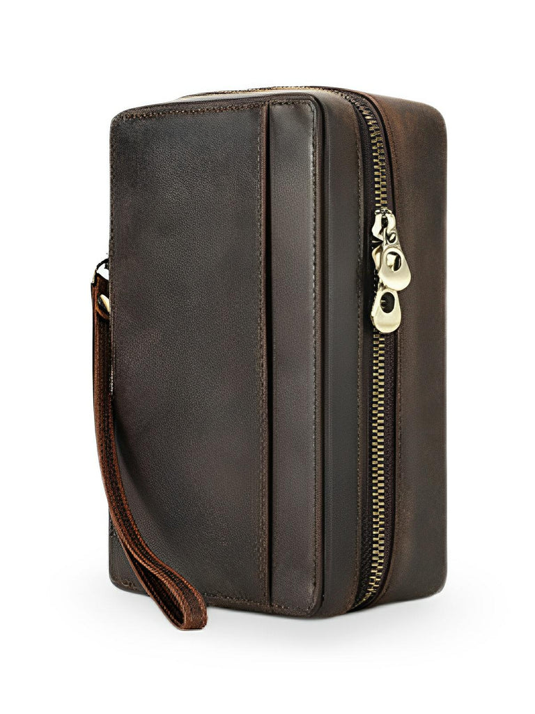 Ausgestattet mit dedizierten Taschen für Ihre Accessoires (Zigarrenschneider, Feuerzeug…), gewährleistet es eine organisierte und sichere Aufbewahrung. Der robuste Reißverschluss sorgt für eine perfekte Dichtheit, während der Lederhandgelenkriemen den Transport erleichtert.