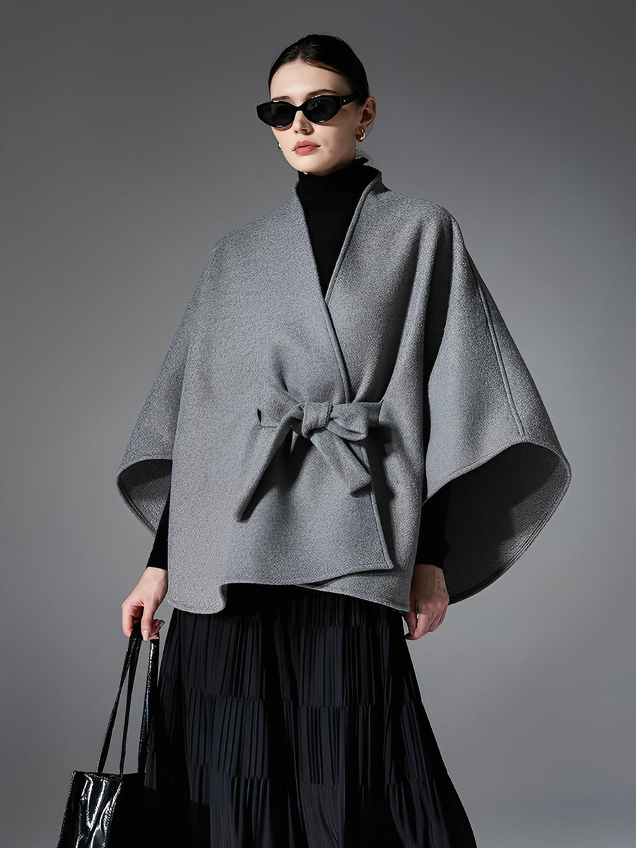 Châle double face chic, cape ceinturée, poncho femme hiver, châle chaud, manteau léger, modèle Kora - Châle - Gris