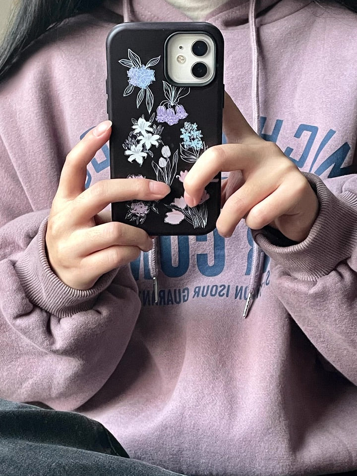 Matte floral phone case, shockproof protection, pastel pattern, compatible with iPhone, raised edges, anti-scratch surface, Lila model