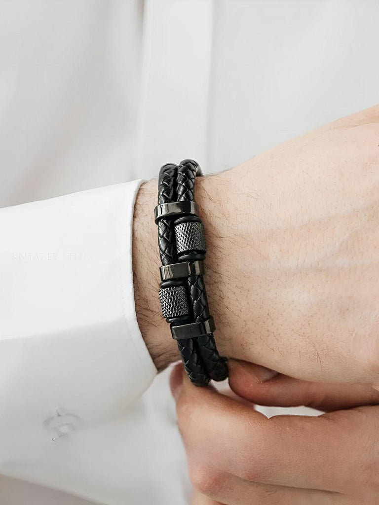 Men's braided leather bracelet, stainless steel, double row, meticulous details, Roselin model