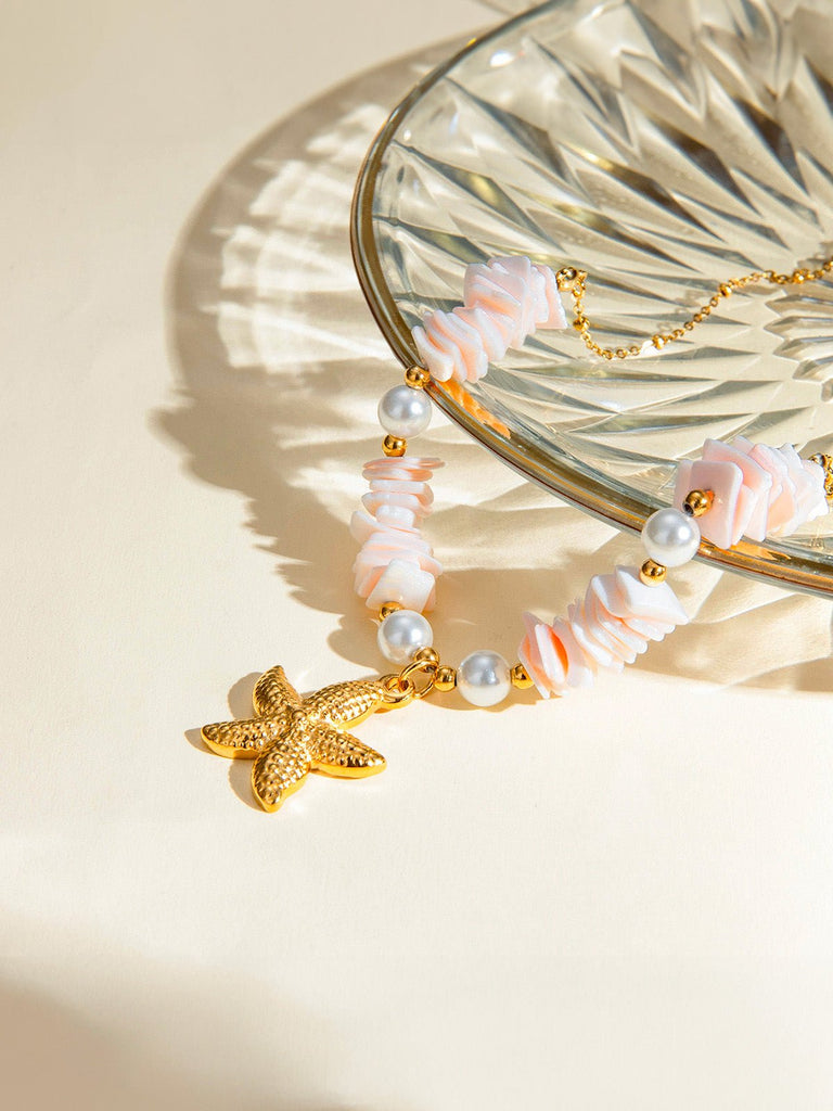 This necklace combines marine accents and trendy design in a bold and luminous composition. The fine gold chain highlights a succession of polished pink shells, accompanied by pearly beads and golden beads, for a refreshing summer aesthetic. At its center, a golden starfish pendant draws the eye and adds a unique touch of character.