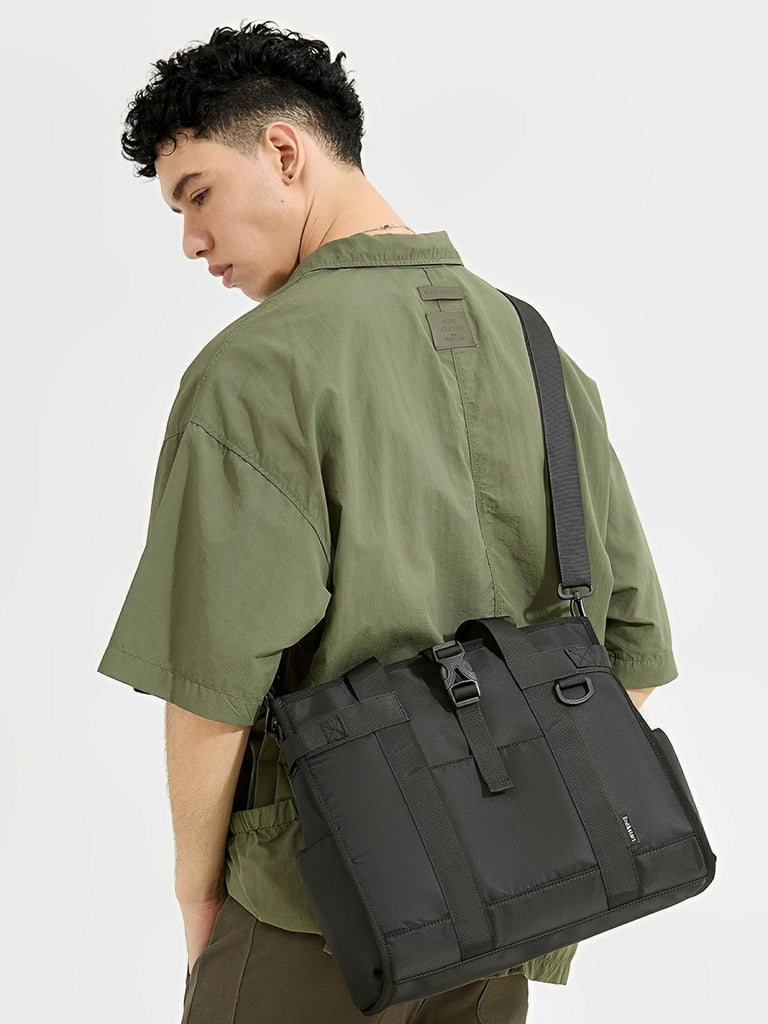 This shoulder bag is designed for those who seek both practicality and modernity. Made from water-resistant Oxford fabric, it effectively protects your belongings from the elements while offering a sleek and urban look. Its large main compartment allows you to carry a laptop up to 14 inches, as well as various essential everyday accessories.