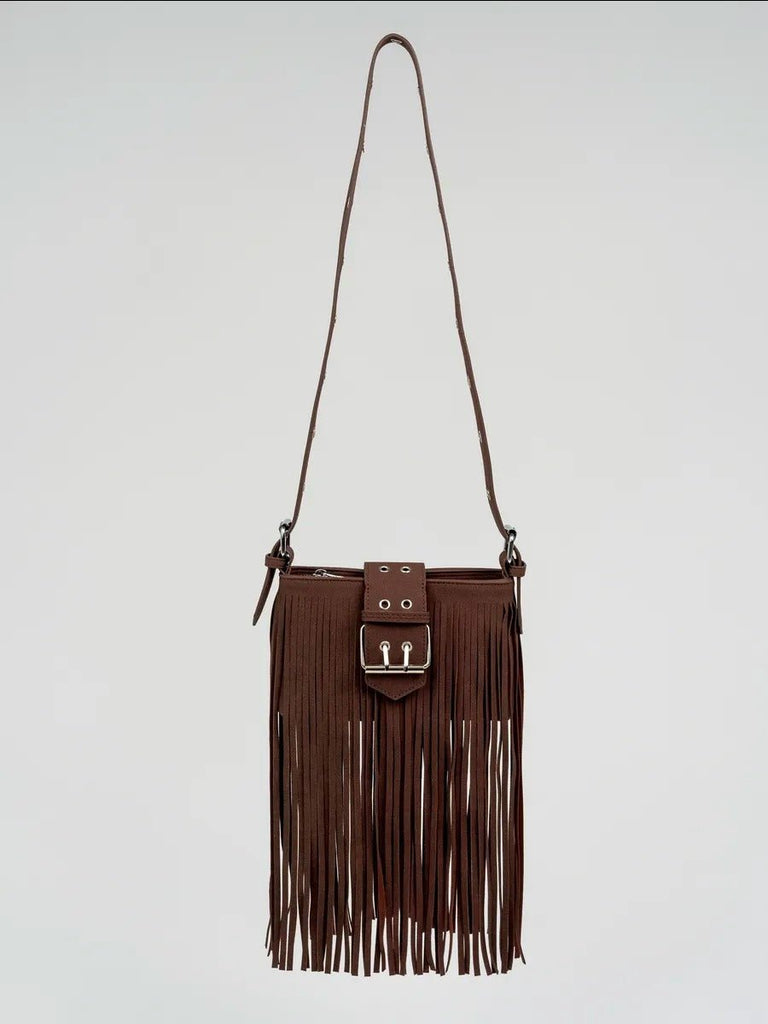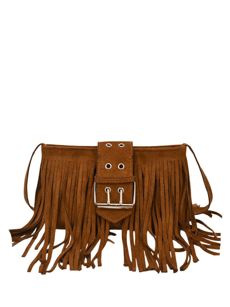 Dive into the world of bohemian style with this compact fringe bag. This model in soft and textured suede material features a bold design with its large central buckle and long supple fringes that move with you.