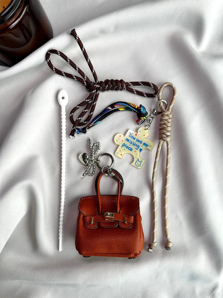 Add a touch of playful style to your bag with this one-of-a-kind bag charm. Designed as a rich visual composition, it stands out with a mini brown faux leather pouch, inspired by iconic Birkin-style models. Every detail counts: a metal heart pendant hanging from a pearl knot, a pastel puzzle engraved with the message "You are my missing piece", and braided cords with neat finishes.
