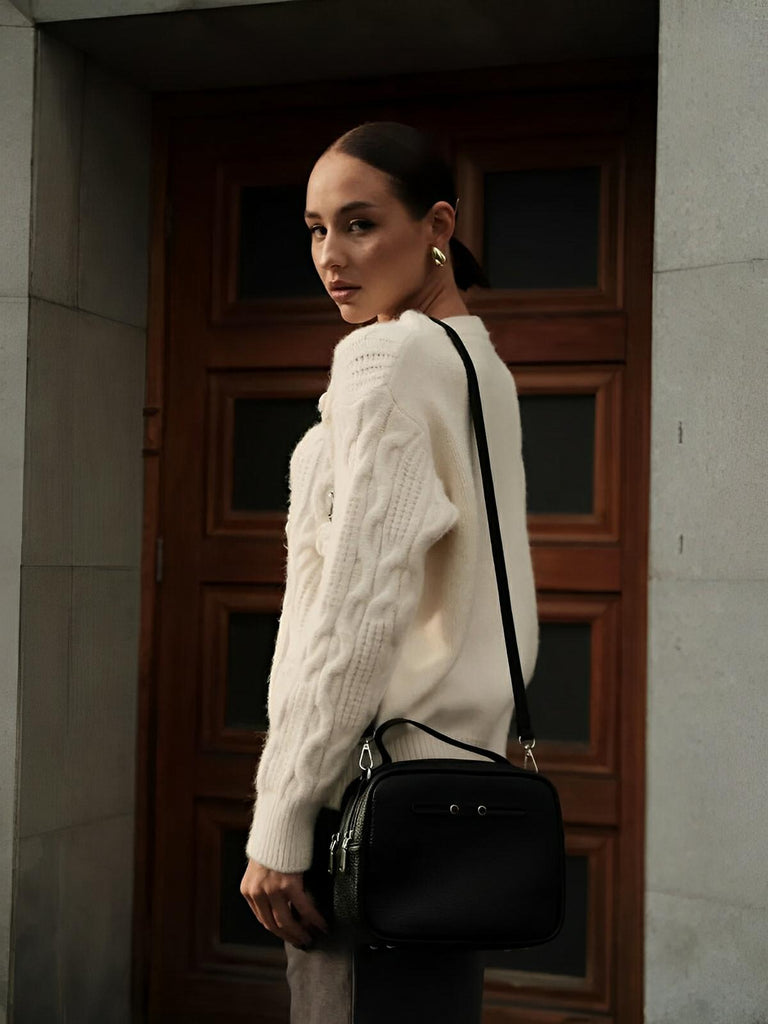 Sac bandoulière femme, en simili vegan véritable, format compact, design structuré, modèle Claudia - Sac Bandoulière - Noir
