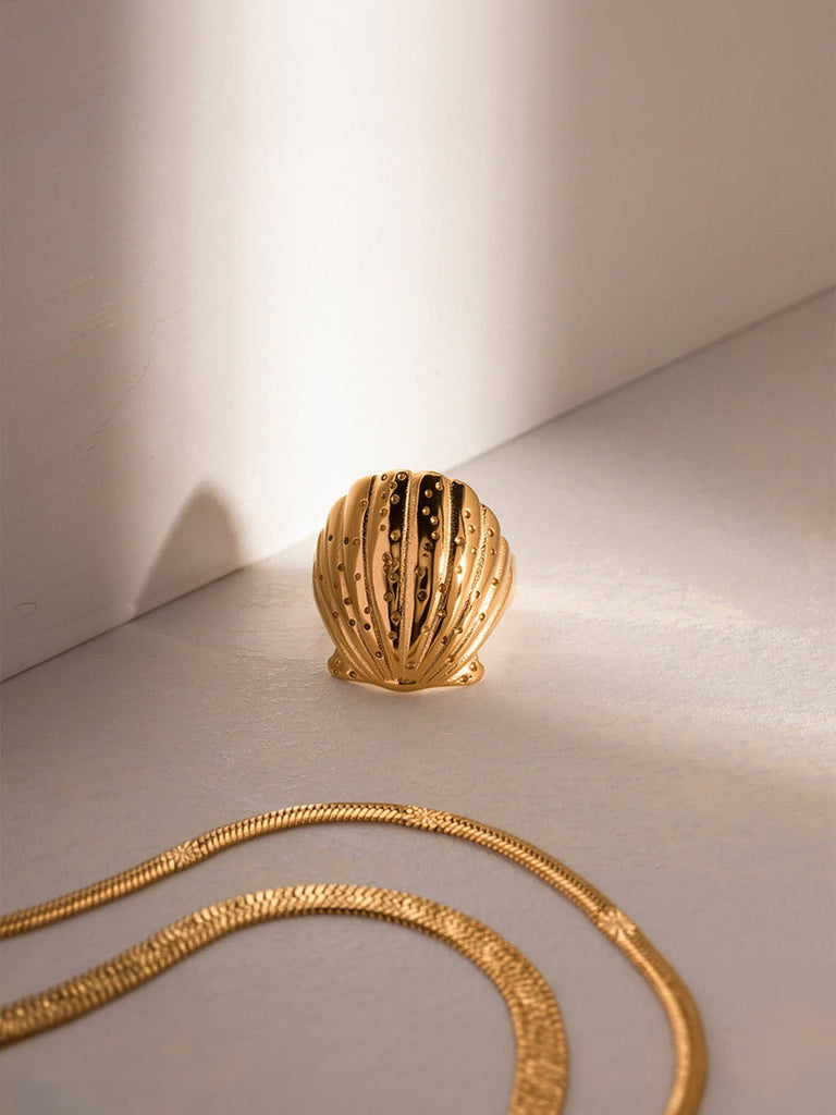 Inspired by the raw beauty of the ocean, this gold shell ring embodies a striking marine silhouette. Its rounded and ribbed shape evokes a sea shell gently polished by the waves, bringing a summery touch to any hand.