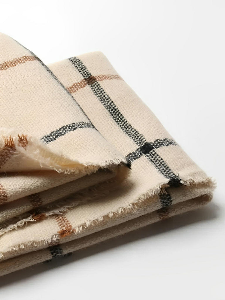 Its generous 180 cm length allows it to be used both around the neck and draped over the shoulders like a shawl. The checkered pattern, classic and structured, instantly enhances all winter outfits – from a tailored coat to an oversized puffer jacket. The fringed finish adds a discreet and refined touch of texture.