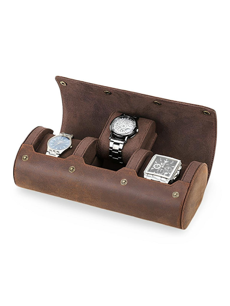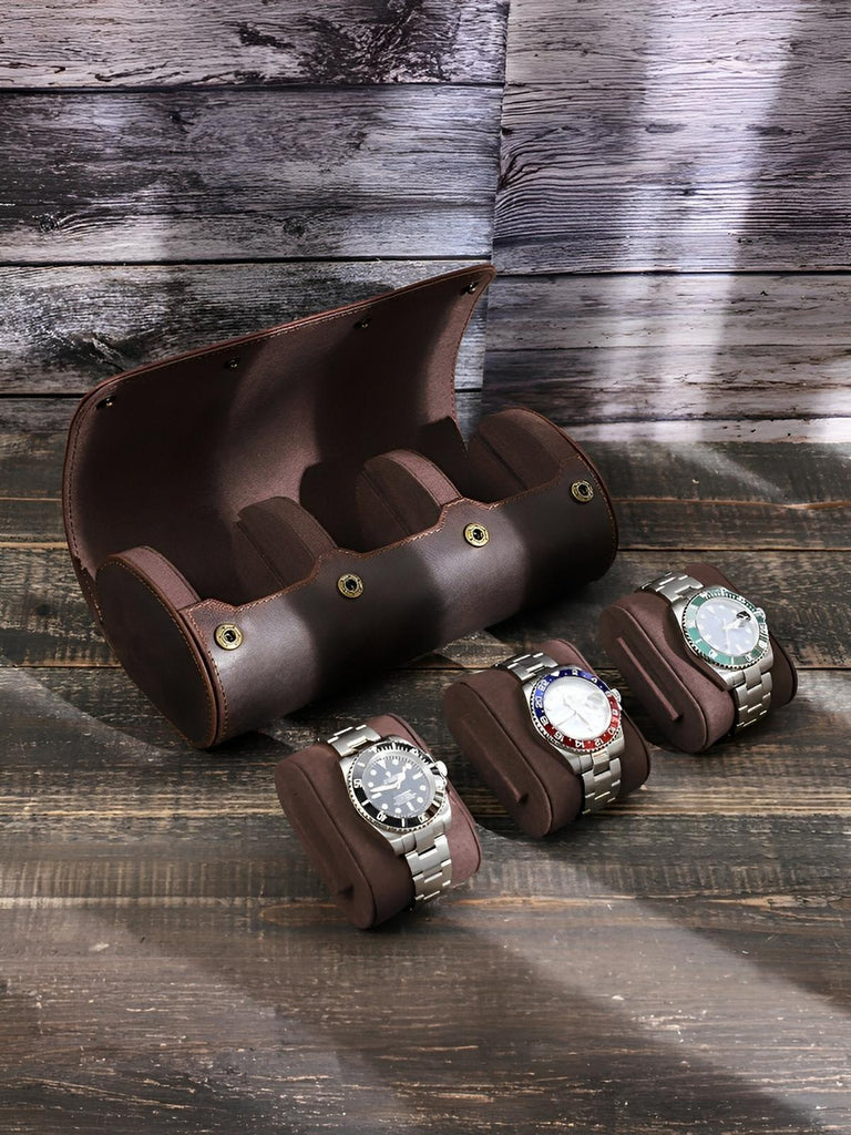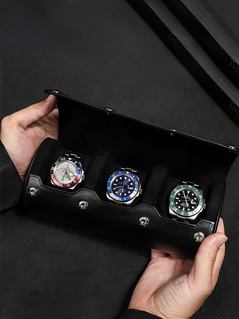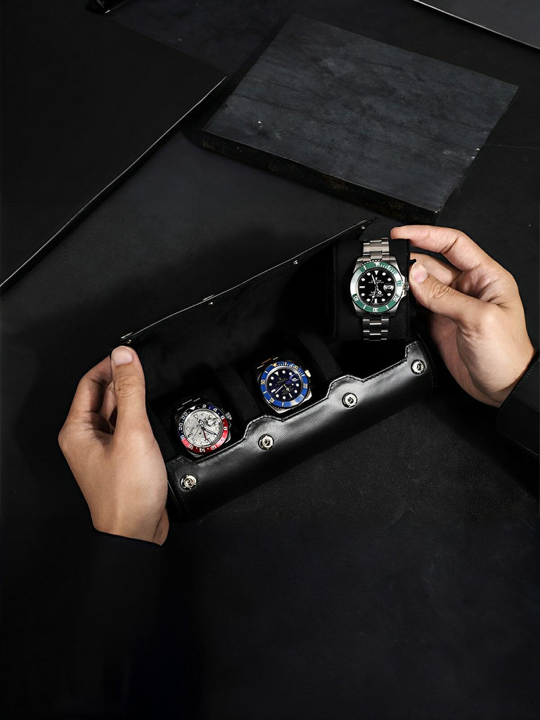 Thanks to its compact design, this case is ideal for watch enthusiasts looking for a secure and easy-to-transport storage. It closes with sturdy snap buttons, ensuring a perfect hold of the lid. The internal dividers keep each watch in place, preventing any unwanted movement.