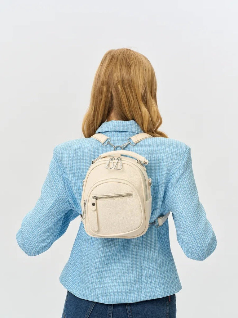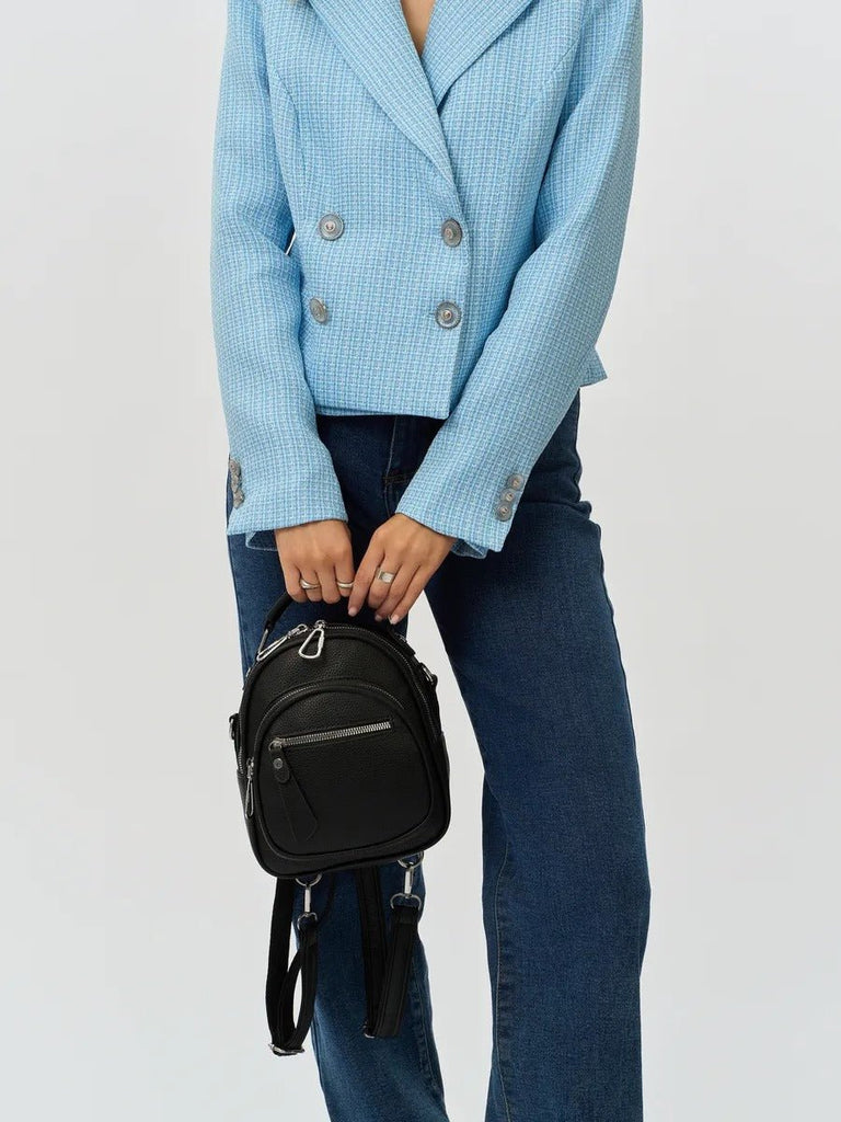 This small multifunction backpack combines practicality and modern style to accompany women in their active daily lives. Made of textured faux leather with a soft and structured silhouette, it perfectly suits all styles, from casual outfits to a more dressed-up look.