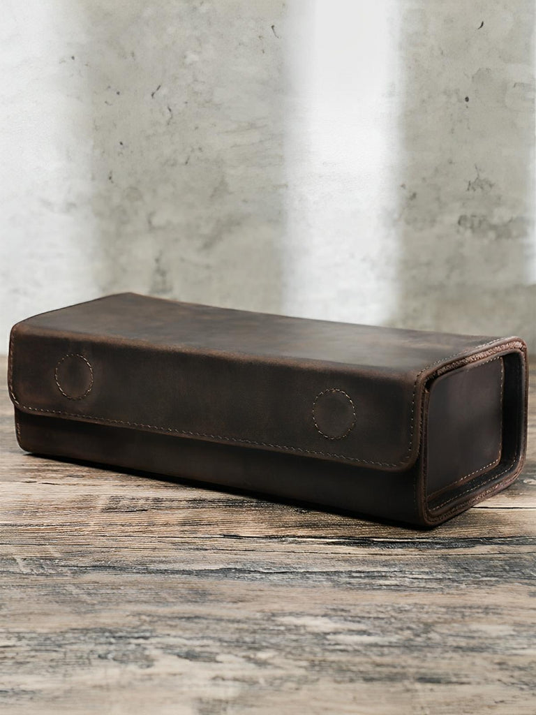 Protect your glasses with this leather case designed to combine functionality and aesthetics. Featuring an elegant and practical design, it can hold two pairs of glasses, whether they are prescription glasses or sunglasses.