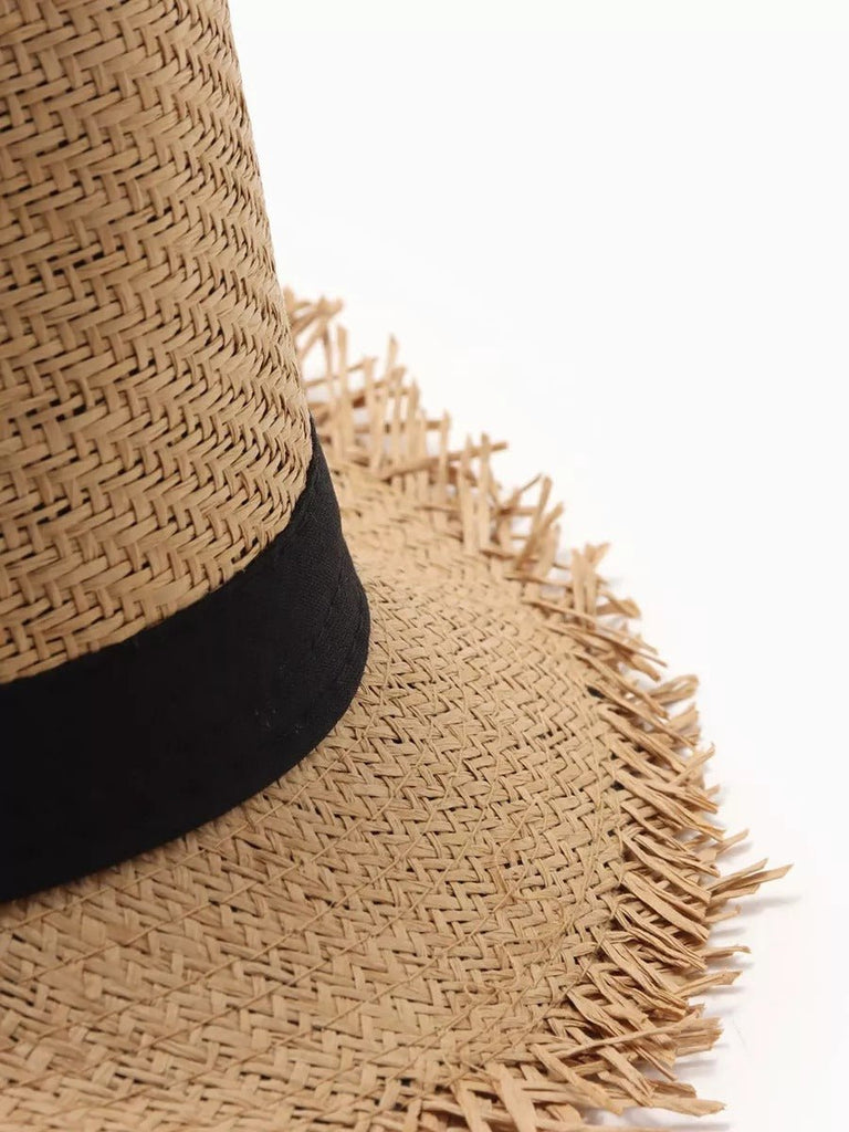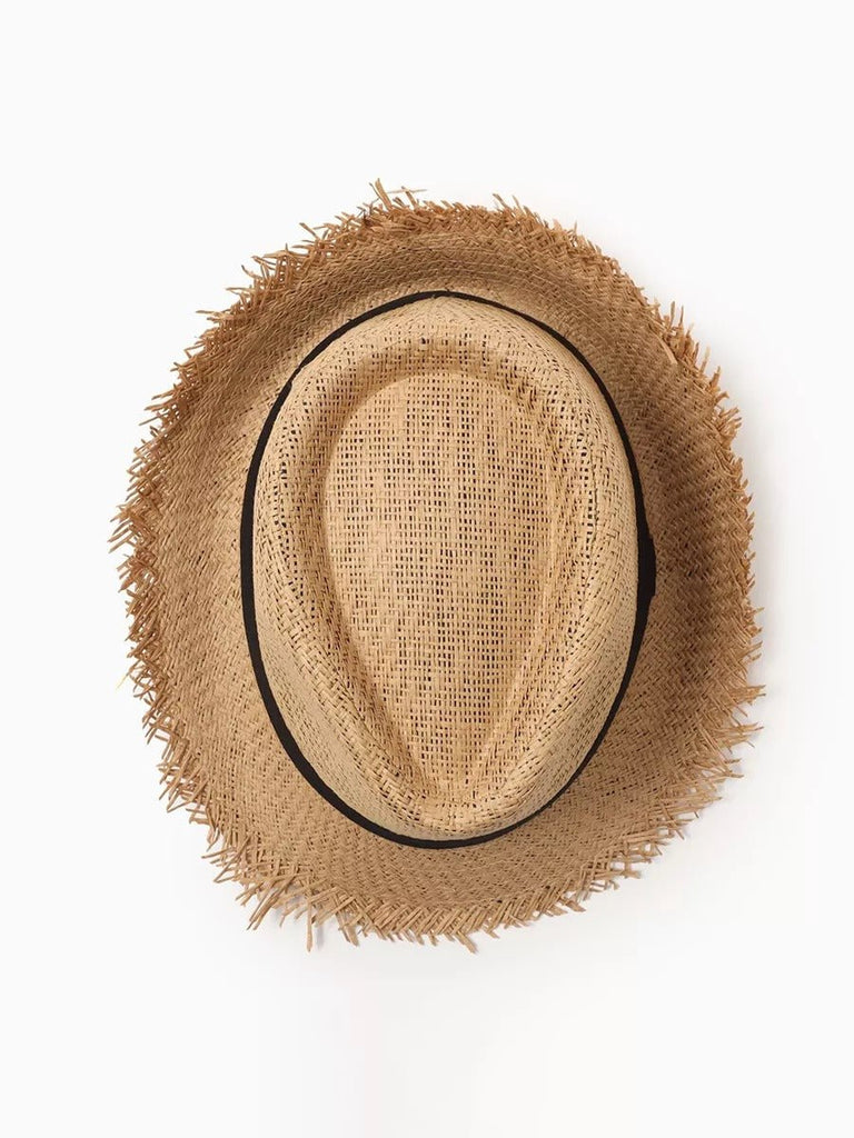 Its fedora-inspired silhouette, structured by a slightly turned-up brim and a pinched crown, is highlighted by a contrasting black ribbon. The frayed brim adds a relaxed and modern touch that enlivens the whole.