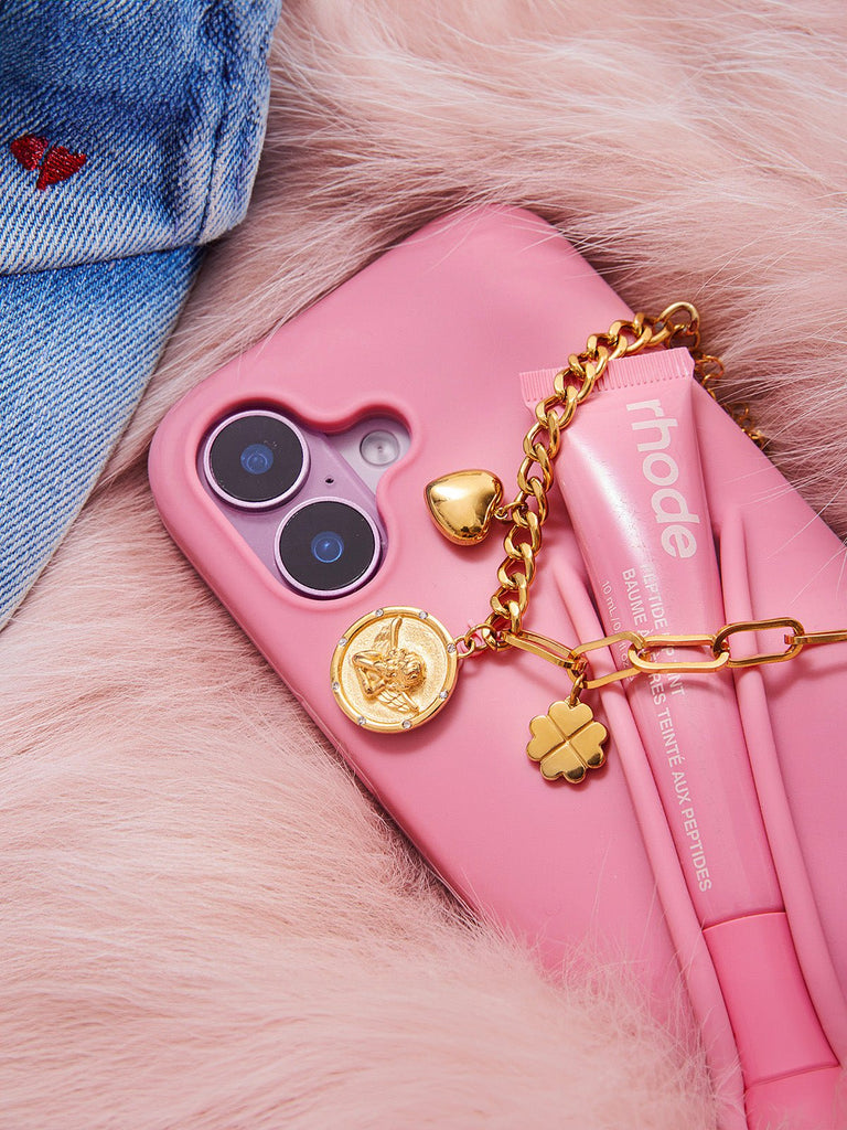 This gold stainless steel bracelet stands out with a harmonious combination of thick and elongated links, enhanced by three symbolic charms: a domed heart, a four-leaf clover, and a medallion engraved with an angel surrounded by small sparkling crystals.