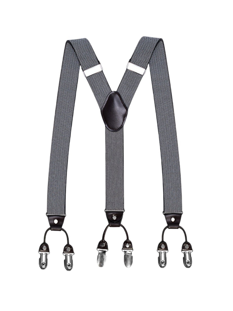 These men's suspenders in a Y shape combine a woven elastic band with genuine leather finishes for reliable support and a bold style. Thanks to their six sturdy metal clips, they ensure a stable attachment to any type of pants, even without belt loops.