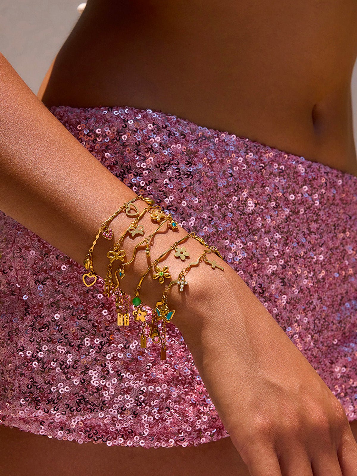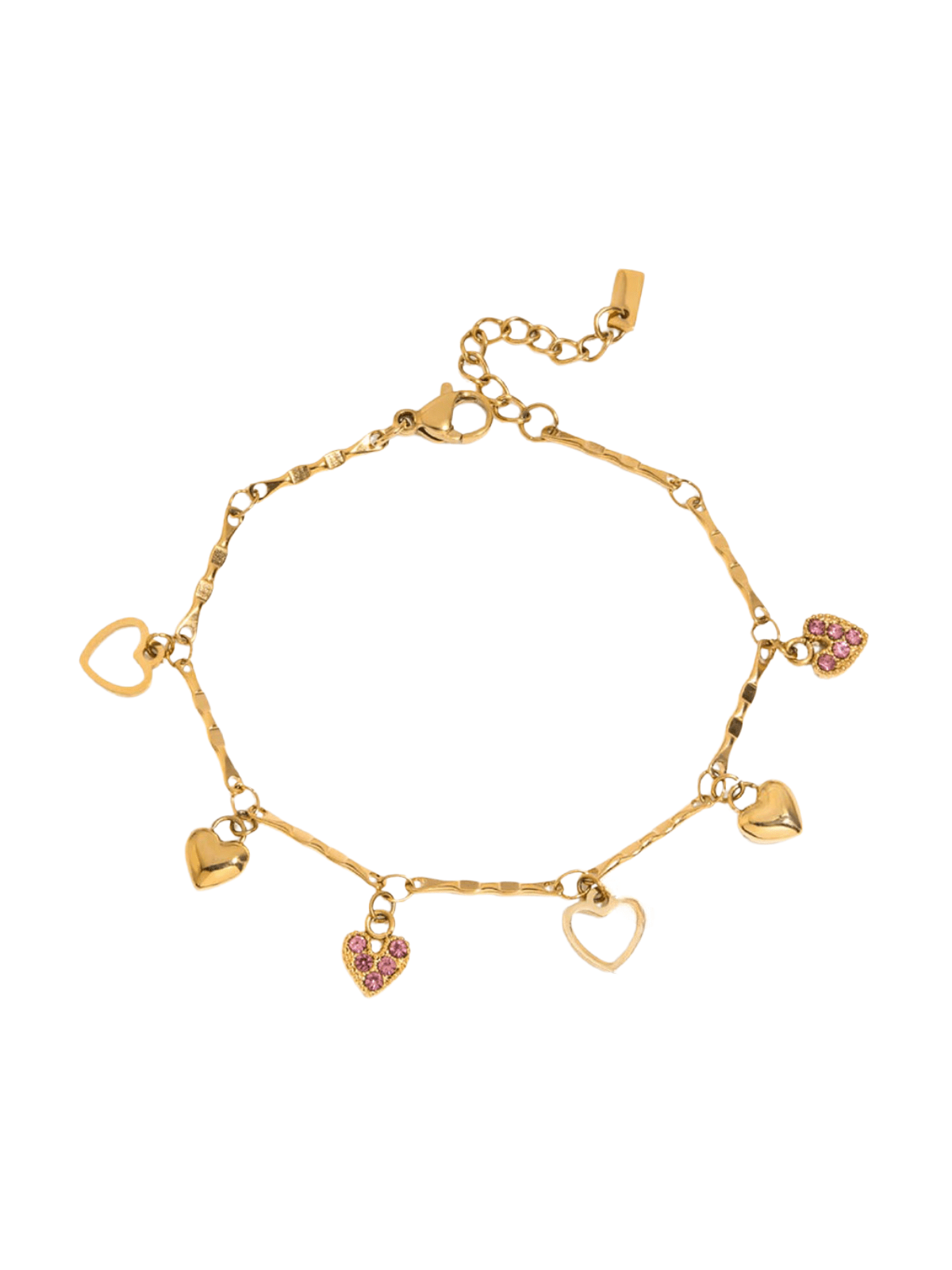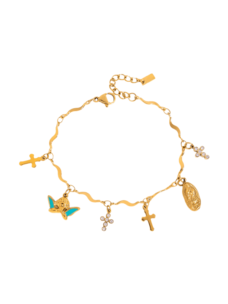 This gold chain bracelet captivates with its refined look and delicate details. Made of stainless steel with a bright gold plating, it consists of fine links adorned with varied charms: hearts, flowers, crosses, and pendants in geometric shapes.