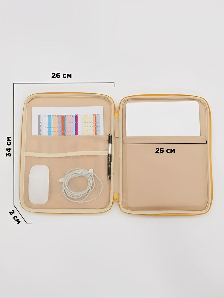 The exterior is made of water-repellent polyester that protects your device from moisture, while the soft beige interior cushions minor shocks. A well-padded main compartment holds your device, and a front zippered pocket allows you to organize your essential accessories like your mouse, cables, or pens.
