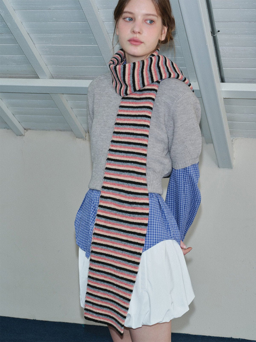 With its 170 cm length, it offers many ways to wear it, whether wrapped to maximize warmth or worn loosely for a more relaxed look. Its geometric stripes with bold contrast – available in black-pink or yellow-green – add a vibrant touch to any winter outfit.