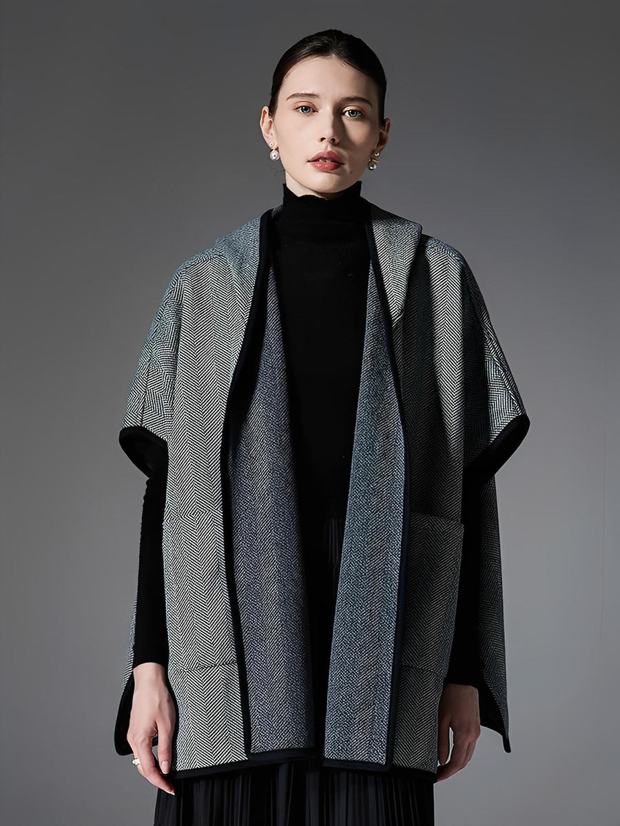 Châle cape à capuche femme, motif chevrons, tissu double face chaud, gris noir, poches latérales, style urbain, automne hiver, modèle Haride