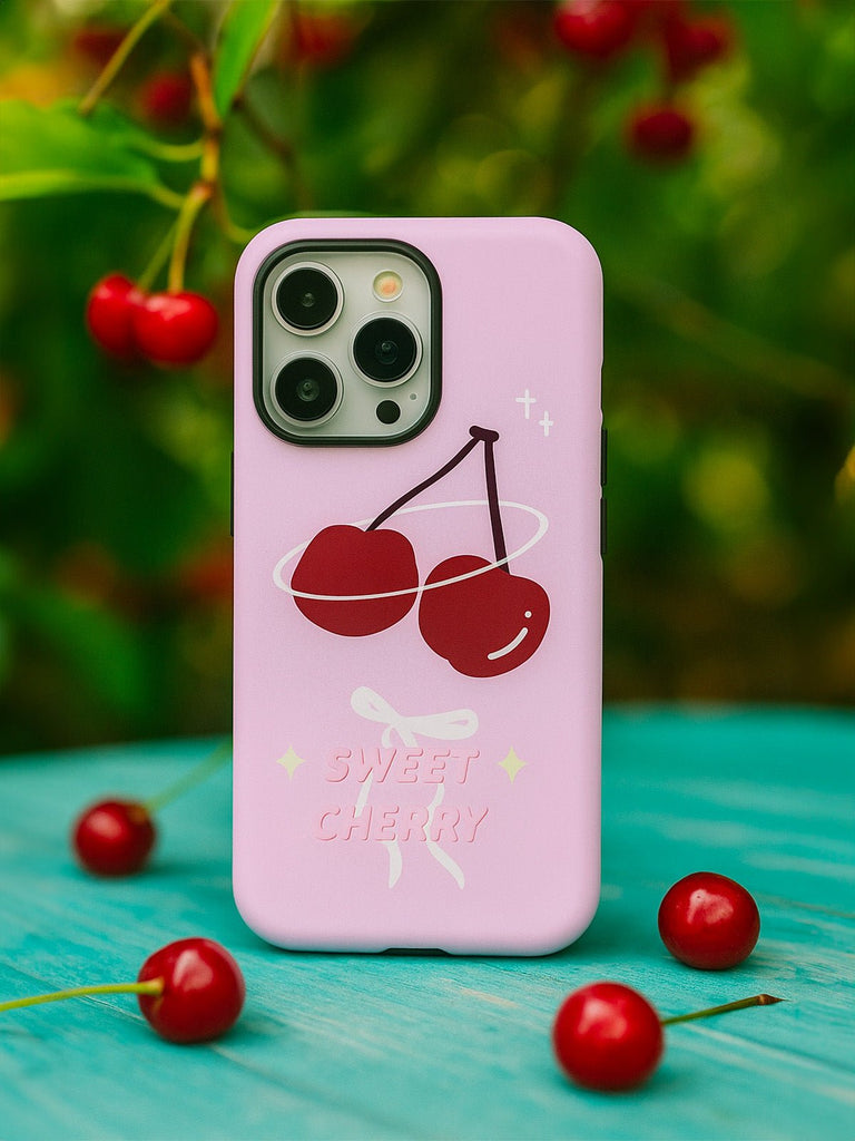 Coque iPhone Sweet Cherry rose, motif cerises ruban, protection antichoc, surface mate, compatible charge sans fil, modèle Cherry