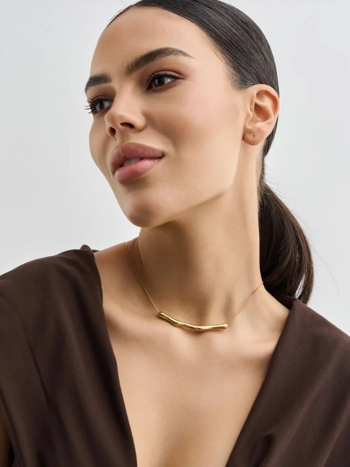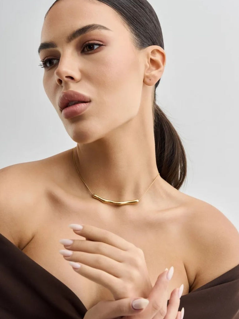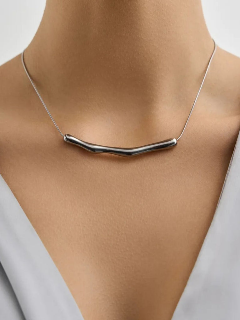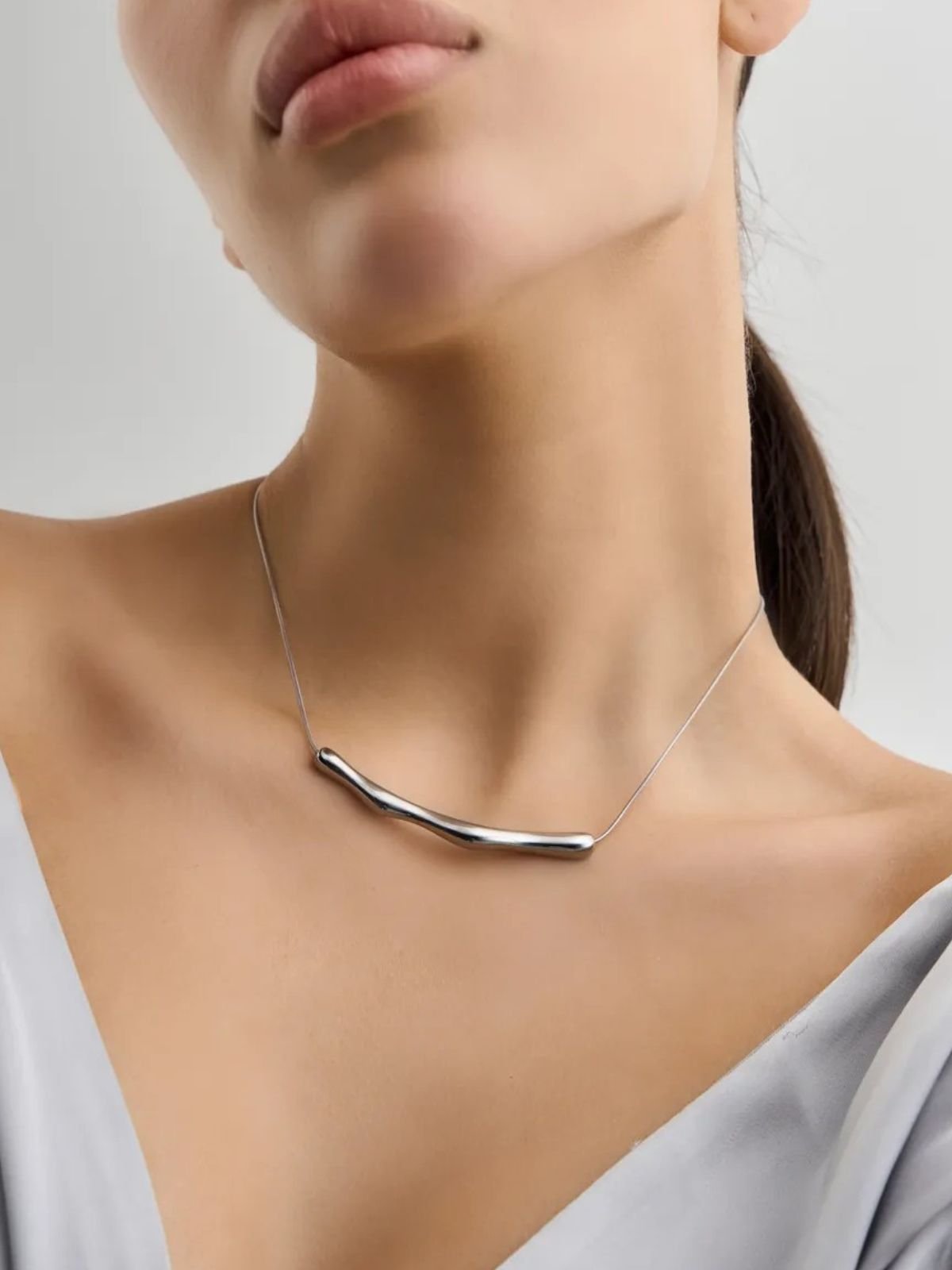 Exprime ta personnalité avec ce collier minimaliste au design sculptural. Son centre rigide adopte une forme irrégulière, fluide et géométrique, pour un effet visuel tout en contraste. Le métal lisse est plaqué or ou argent pour une brillance miroir discrète mais affirmée. La chaîne fine et fluide épouse les courbes du cou, parfaite pour un style froid et structuré.