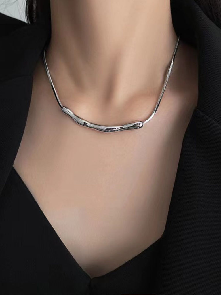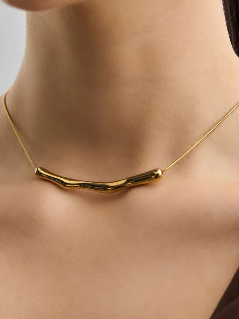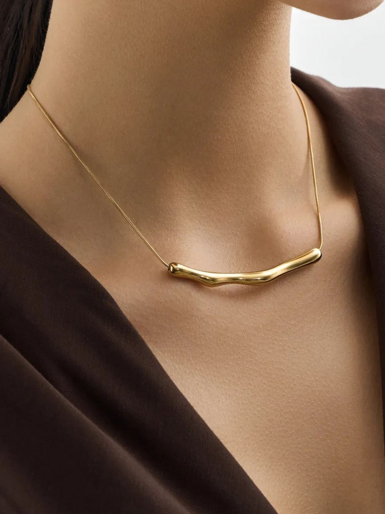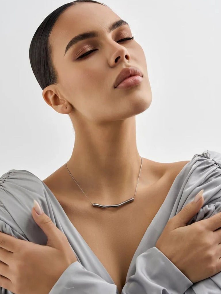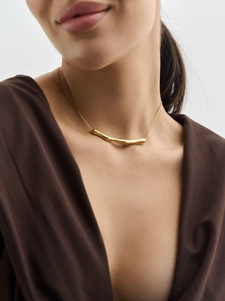 Exprime ta personnalité avec ce collier minimaliste au design sculptural. Son centre rigide adopte une forme irrégulière, fluide et géométrique, pour un effet visuel tout en contraste. Le métal lisse est plaqué or ou argent pour une brillance miroir discrète mais affirmée. La chaîne fine et fluide épouse les courbes du cou, parfaite pour un style froid et structuré.