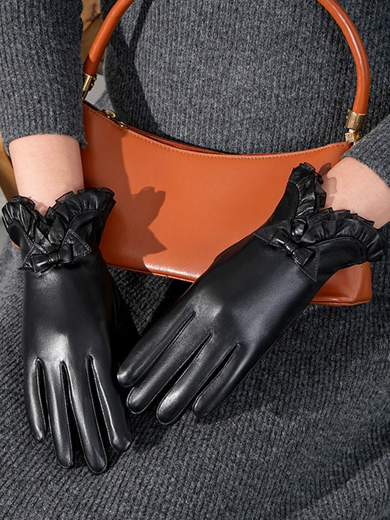 Le détail du nœud en cuir et les volants délicats au niveau du poignet ajoutent une touche féminine unique à cet accessoire. Le design ajusté épouse naturellement la main, assurant un port confortable et une silhouette élégante.