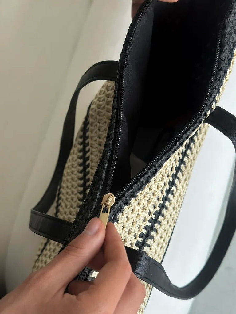 Sac de plage en raphia, tote bag d'été, tissé rayé, grand sac à main, idéal vacances et mer, modèle Léa