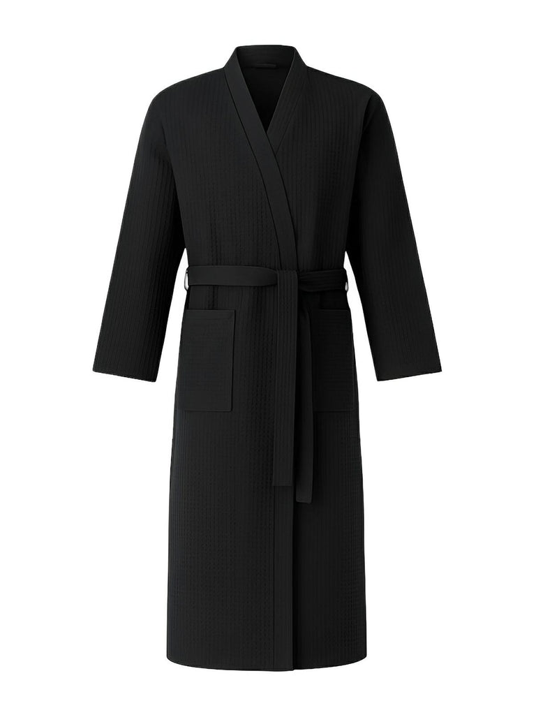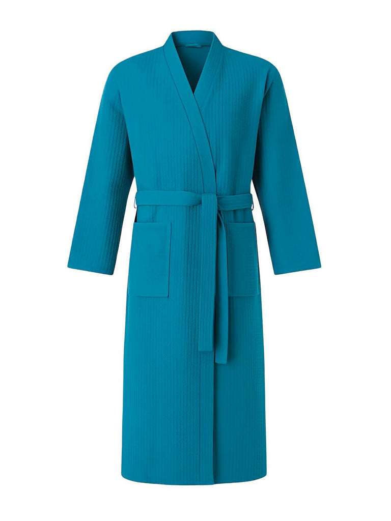 Ce modèle dispose de deux poches pratiques sur le devant, d'une ceinture amovible qui permet un ajustement précis à la taille et d'un col V inspiré des peignoirs kimono. La coupe longue enveloppe parfaitement le corps, garantissant une liberté de mouvement totale.