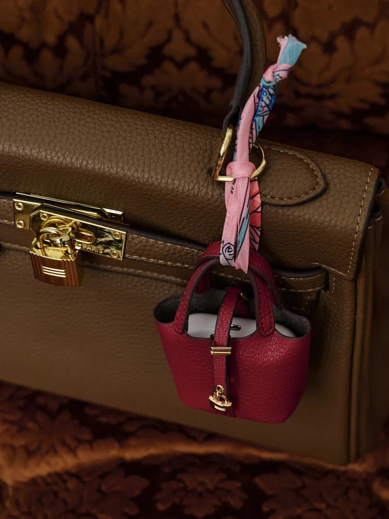Grâce à son format idéal, ce mini sac peut accueillir un étui d'écouteurs comme les AirPods ou tout autre petit objet précieux. Il s’attache facilement à un sac à main, un sac à dos ou même à des clés via son ruban imprimé et son anneau doré, transformant un détail en signature personnelle.