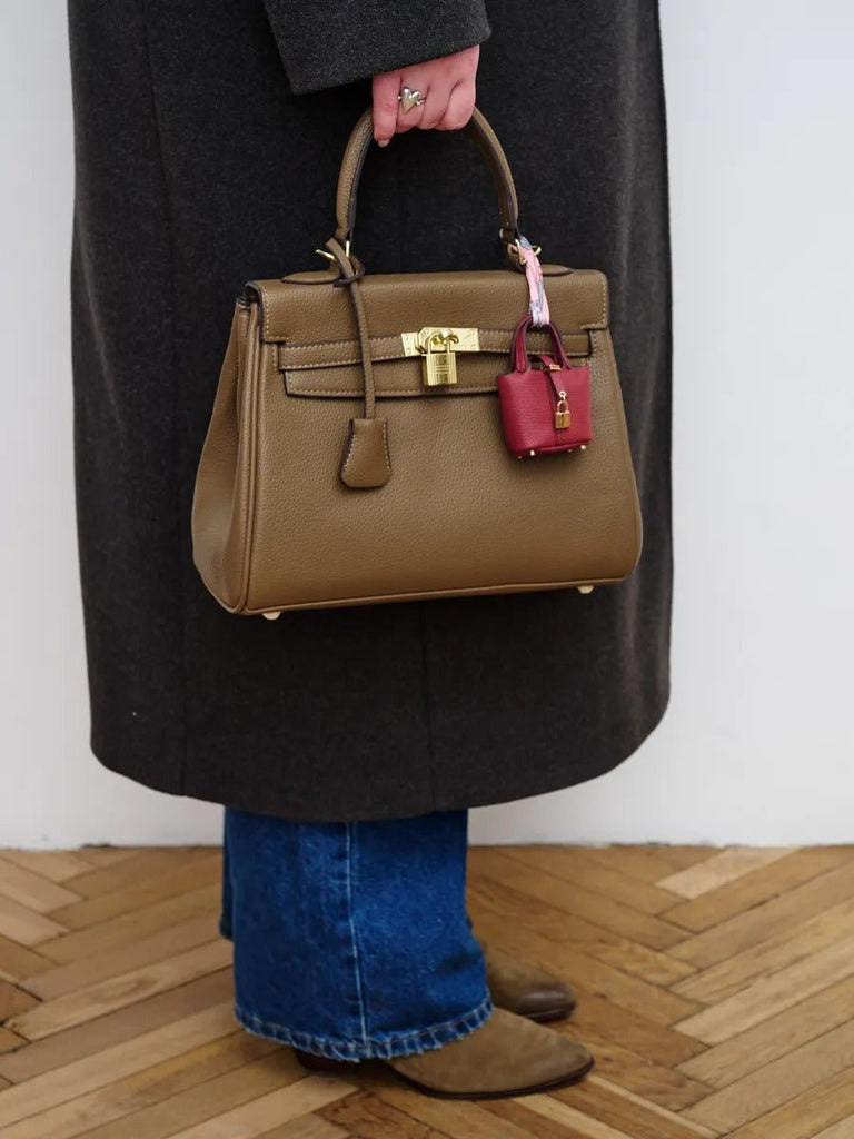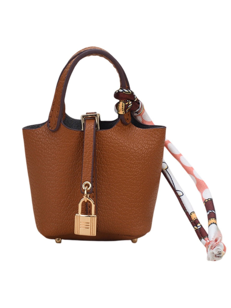 Ce bijou de sac en forme de mini cabas revisite le charme des accessoires Hermès avec une touche malicieuse et raffinée. Confectionné en simili vegan grainé, il reproduit fidèlement les codes des sacs iconiques tout en offrant un format compact et fonctionnel.