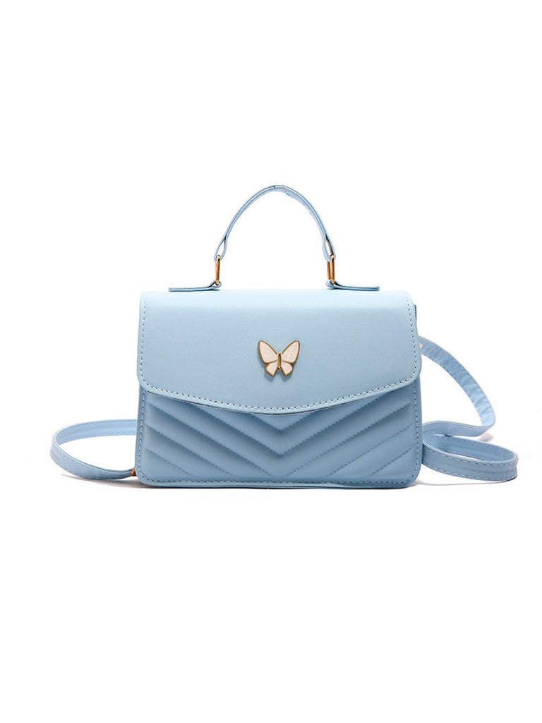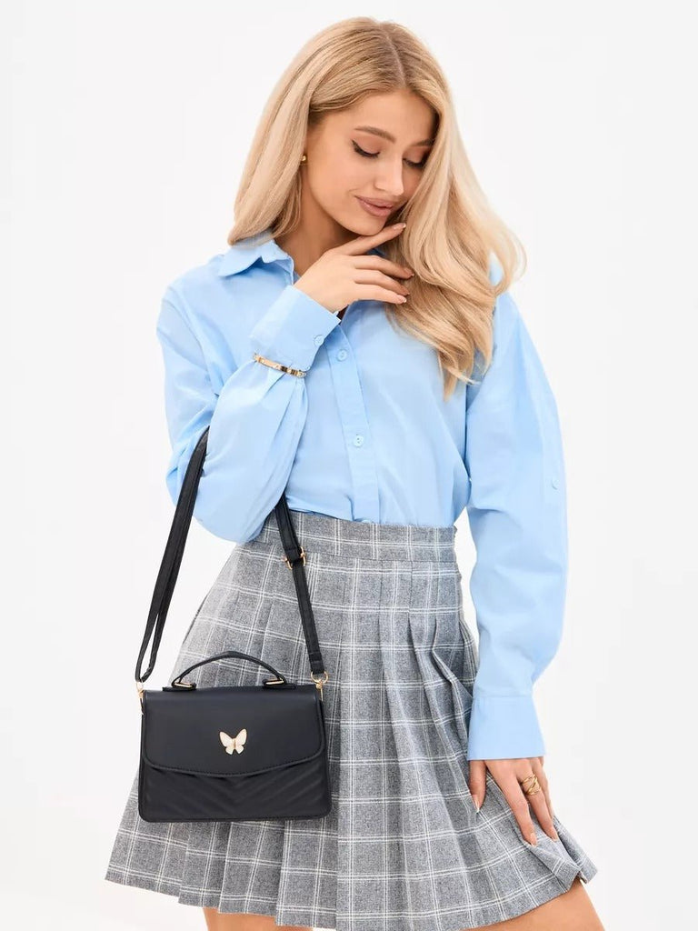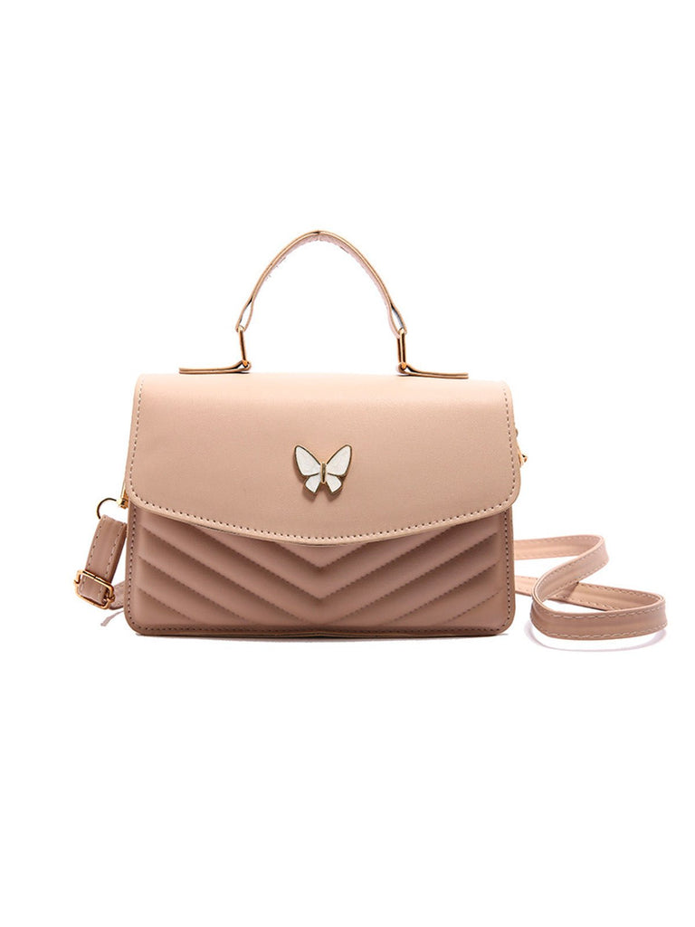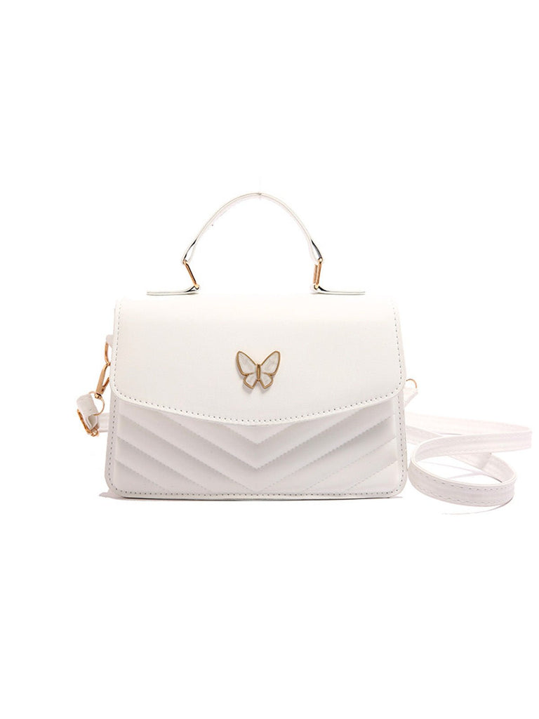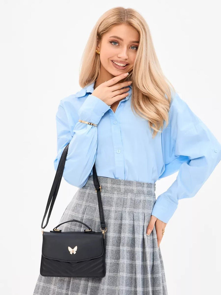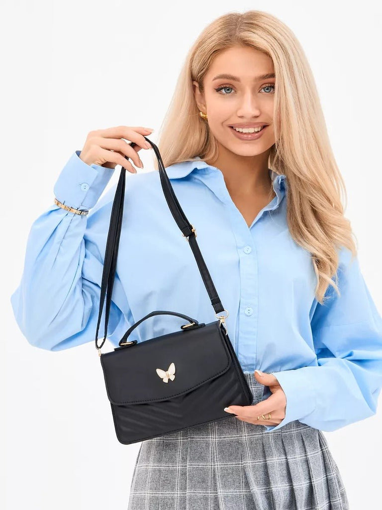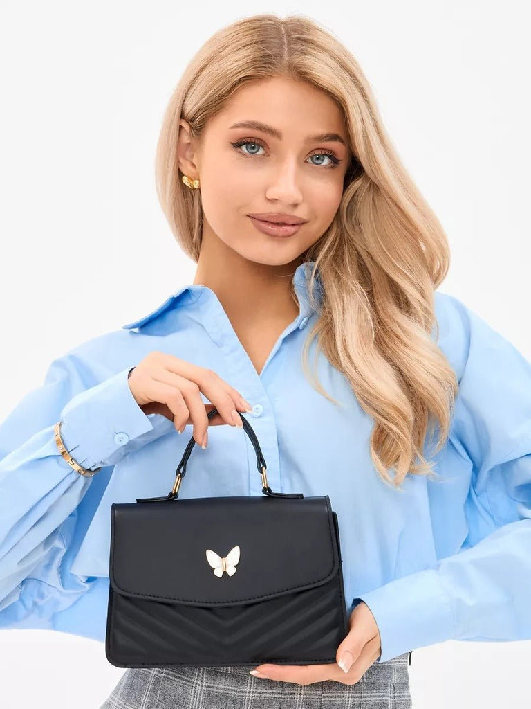 Doté d’un rabat aimanté et d’une bandoulière ajustable, il se porte aisément à l’épaule, en travers ou à la main grâce à sa poignée courte. Le détail papillon doré à l’avant en fait un accessoire subtil mais affirmé.