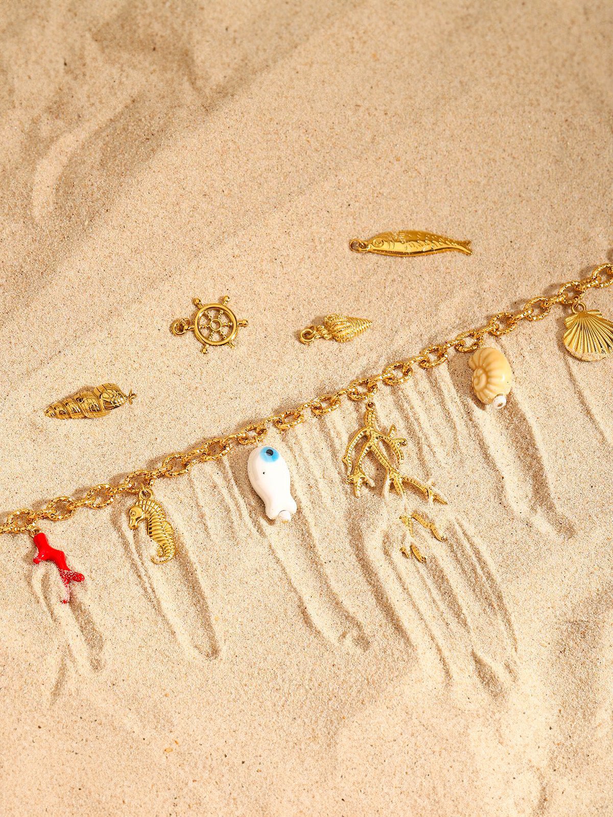 Ce collier capture l’esprit des vacances au bord de mer avec une chaîne dorée ornée de pendentifs inspirés de l’océan. On y découvre une branche de corail dorée, des coquillages sculptés, un hippocampe texturé, et même un petit poisson stylisé en céramique blanche. Chaque élément apporte une touche ludique et raffinée à l’ensemble.