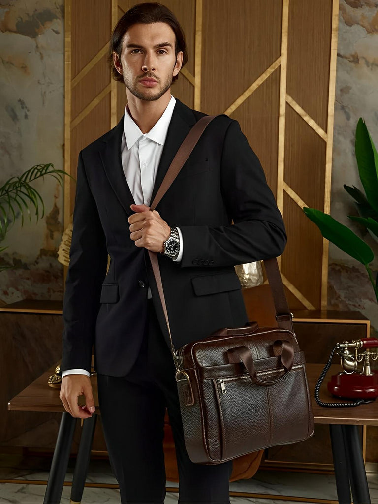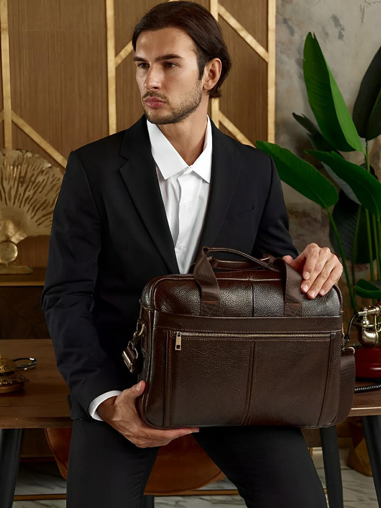 Ce porte-document pour homme en cuir véritable est conçu pour allier fonctionnalité et style. Idéal pour les professionnels et les voyageurs, il offre une grande capacité tout en restant compact et facile à transporter. Son compartiment dédié permet de sécuriser un ordinateur jusqu'à 14 pouces, tandis que ses multiples poches facilitent l'organisation de vos documents et accessoires.
