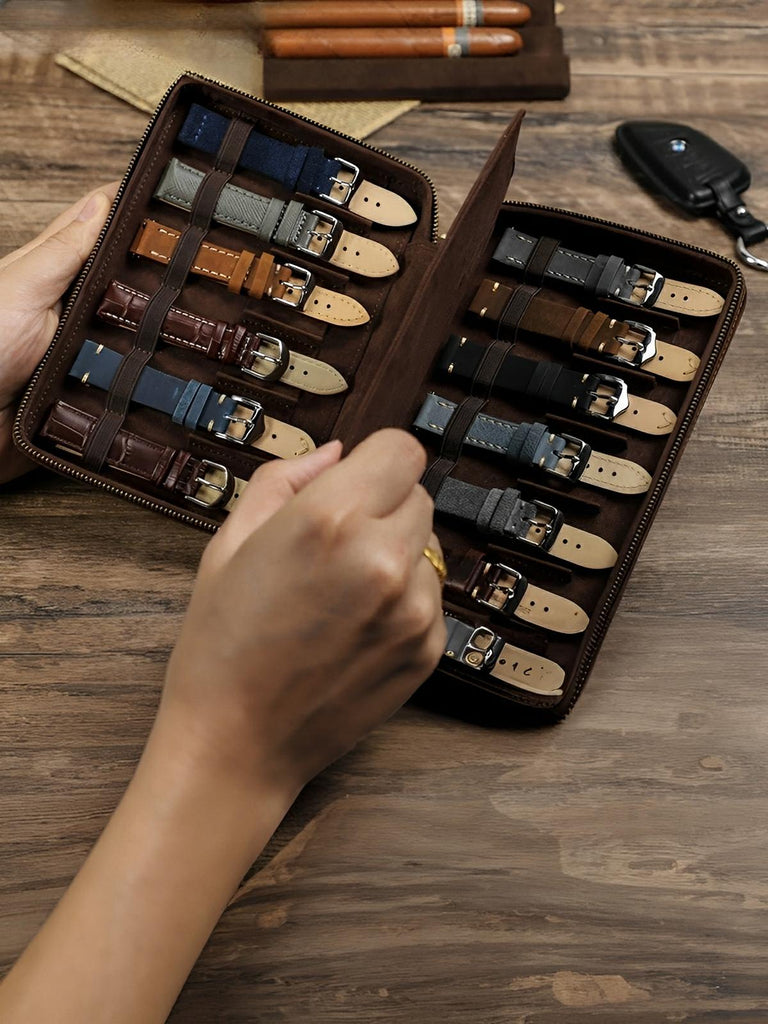 Protégez et organisez vos bracelets de montre avec ce coffret de rangement en cuir véritable. Conçu pour accueillir jusqu'à 12 bracelets, il assure une présentation soignée et une protection optimale contre les rayures et la poussière.