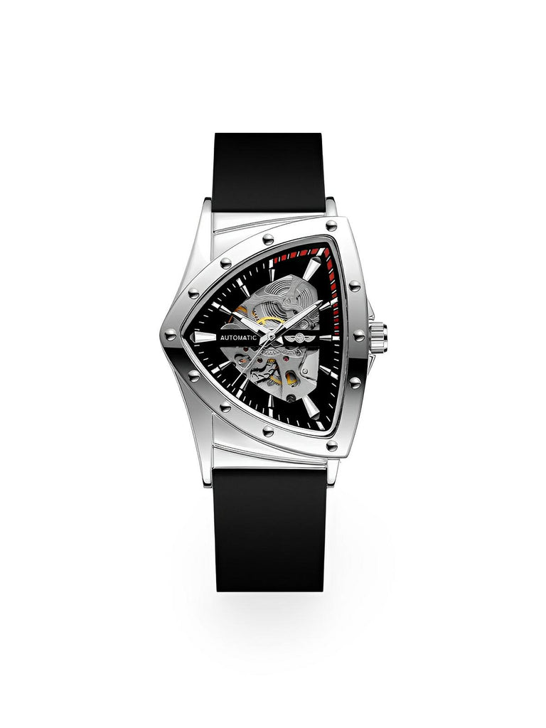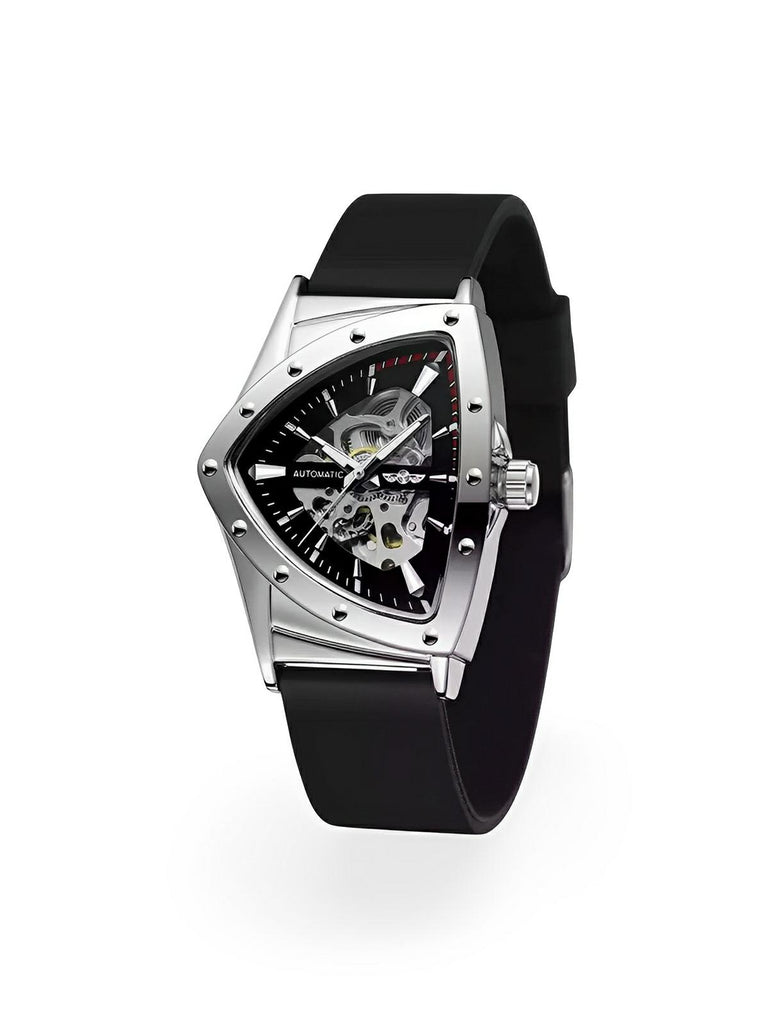 Montre homme automatique, boîtier triangulaire, cadran squelette, bracelet silicone, aiguilles luminescentes, modèle Karl