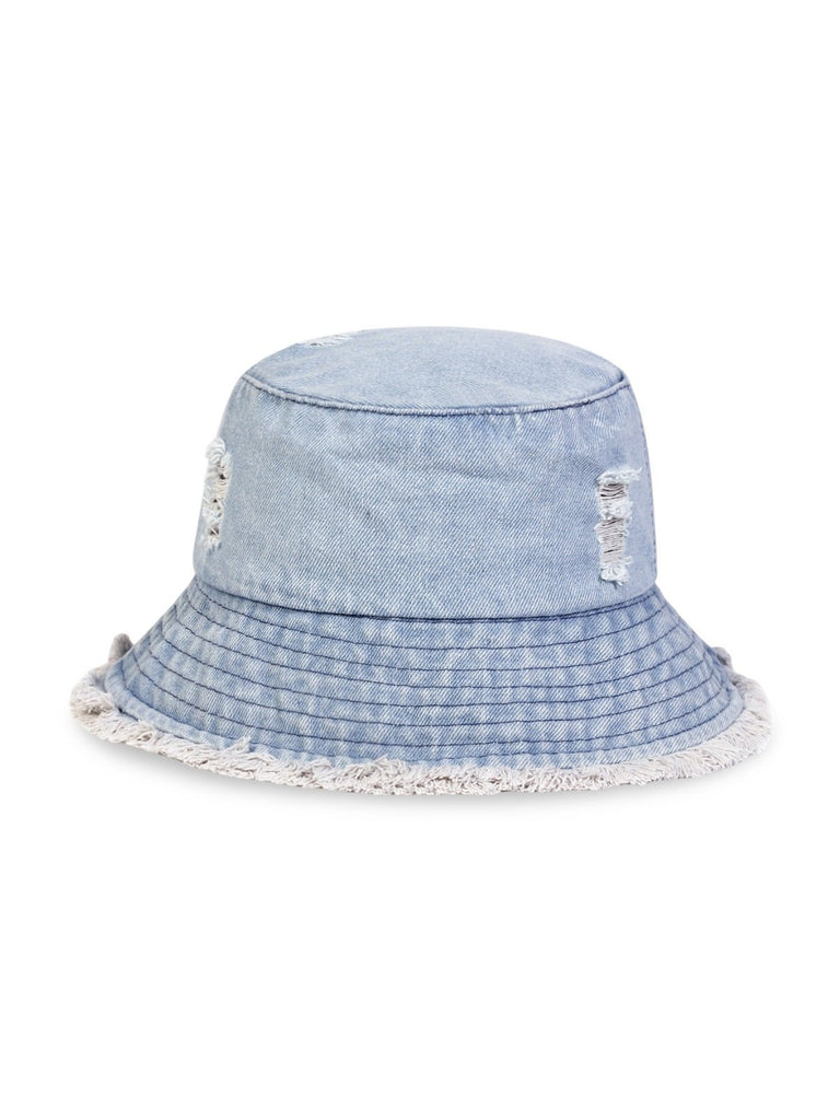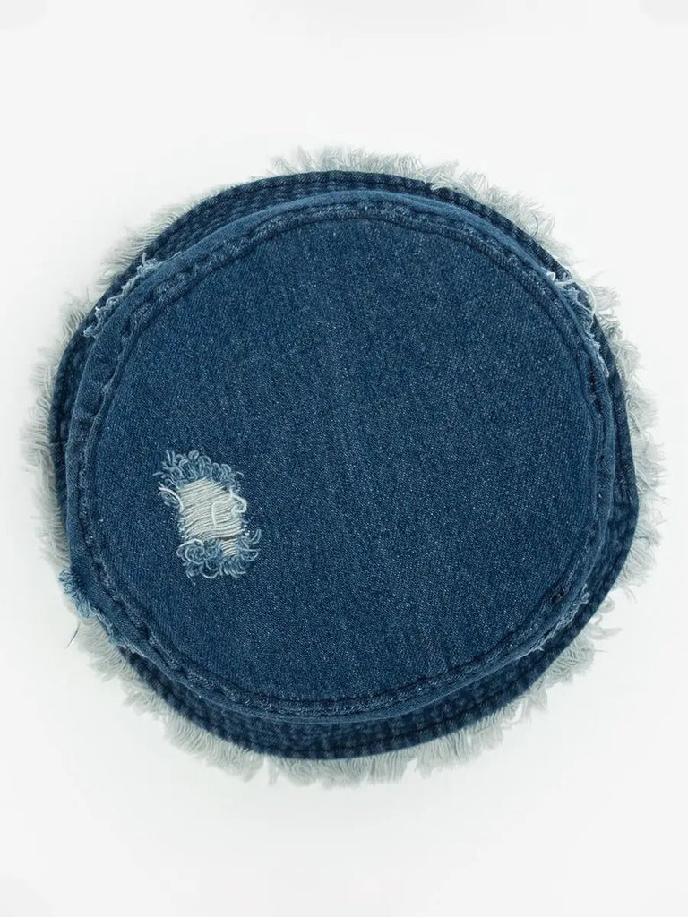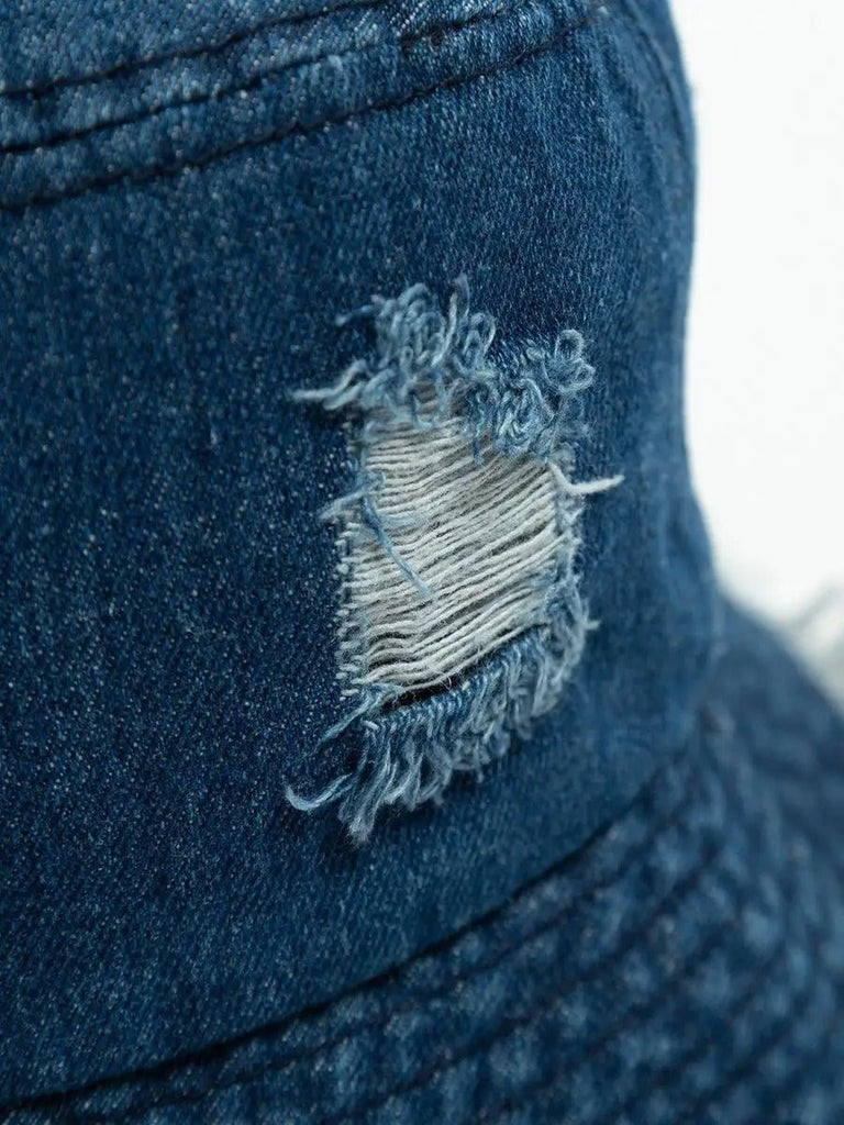 Bob en jean usé, effet vieilli, bords effilochés, style unisexe, tendance Y2K, modèle Kelips